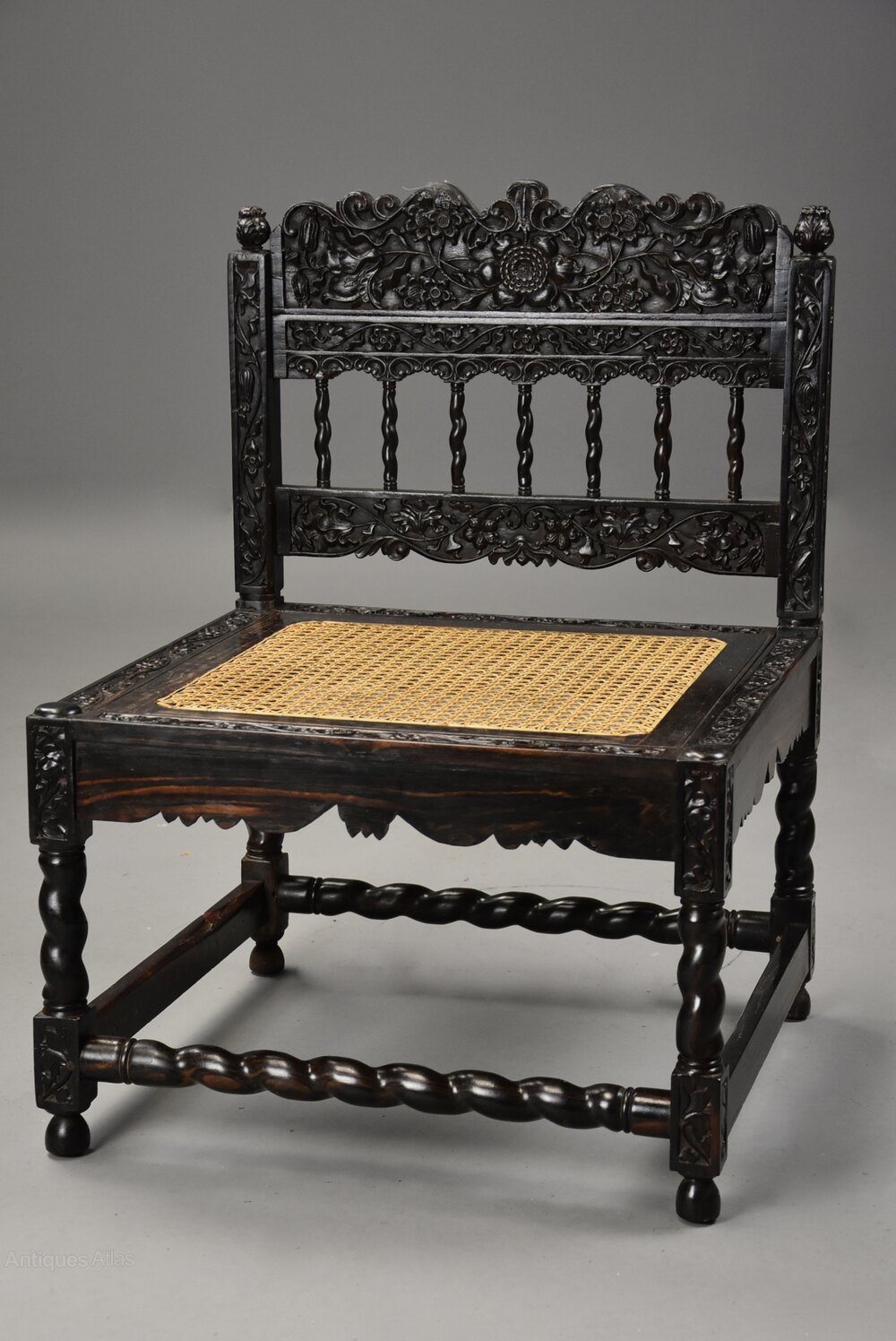 The chair is supported on twist-turned legs with low relief carved blocks to the top and bottom joined by stretchers, the front and rear of twist-turned design and terminating on turned feet.