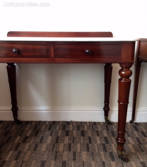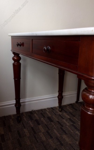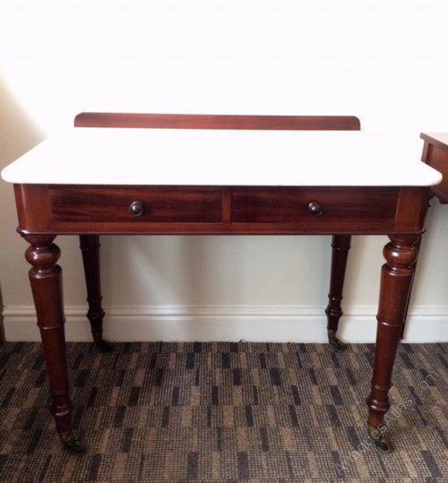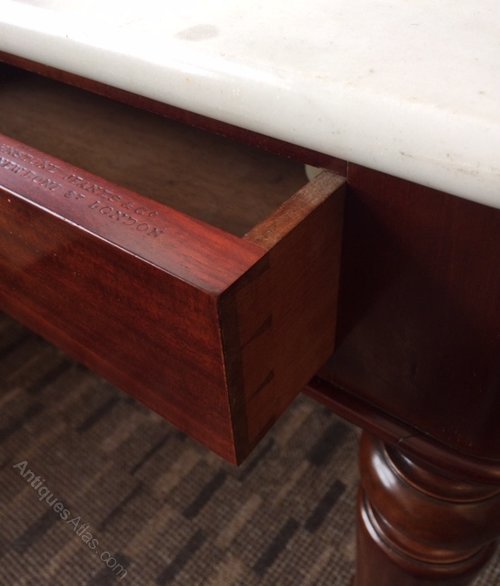A superb quality Victorian mahogany marble topped dressing table or side table made by the accomplished cabinet makers Johnstone & Jeanes of New Bond Street London. The original marble top with mahogany upstand, over two drawers and four elegant turned and tapering legs, standing on the original brass castors. Drawer stamped Johnstone & Jeanes & Co 67 New Bond Street London.