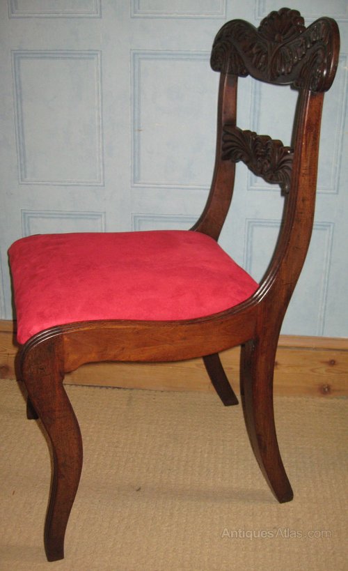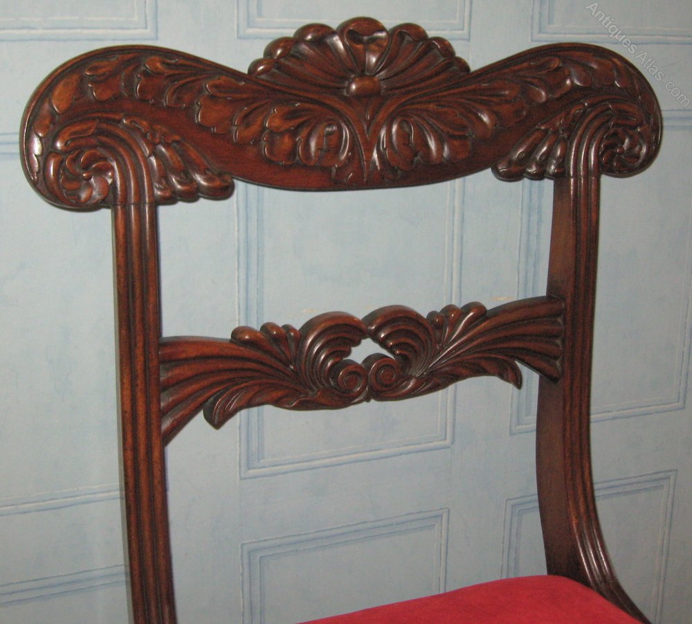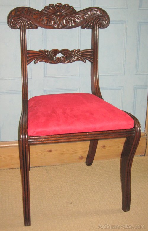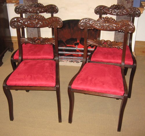 A wonderful set of four Regency period mahogany dining chairs. The chairs are just wonderfully and profusely carved with stylised acanthus leaves and lotus flowers. The chairs stand on sabre legs with fluted edges, and the whole just epitomize the Regency period. The chairs have drop in seat that have been upholstered in red faux suede. The chairs have had some minor restoration and have retained the original patina and colour and are very sturdy and useable. C.1820.