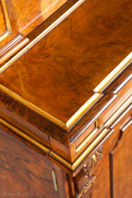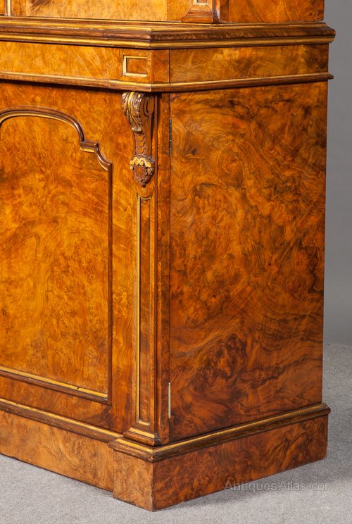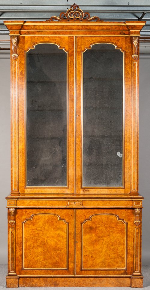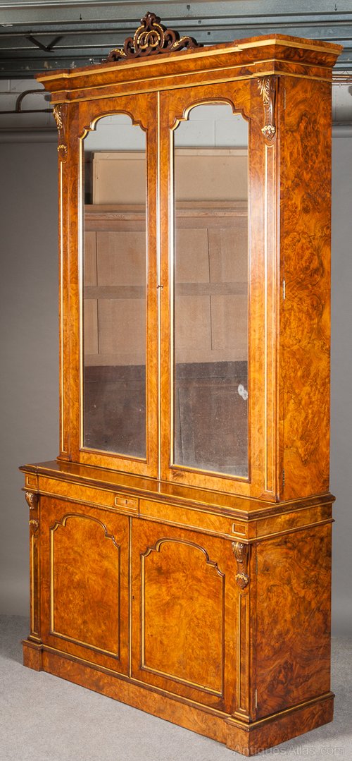 An exceptional quality, very tall, London made burr walnut bookcase from the Victorian period, of shallow inverted breakfront form with 4 shaped and arched doors and full width drawer. Base doors with burr walnut panels, the top doors with original plate mirror and good quality mahogany backing. The cornice has a pierced and carved crown with gilded decoration. The door mouldings, styles, corbel carvings, drawer and plinth all with original subtle gilding. Locks by "Hobbs + Co" with original key. This fine Victorian bookcase bears the brass plaque of the maker " Hewetson & Milner, The Exchange, 211, 212 Tottenham Court Road" London.