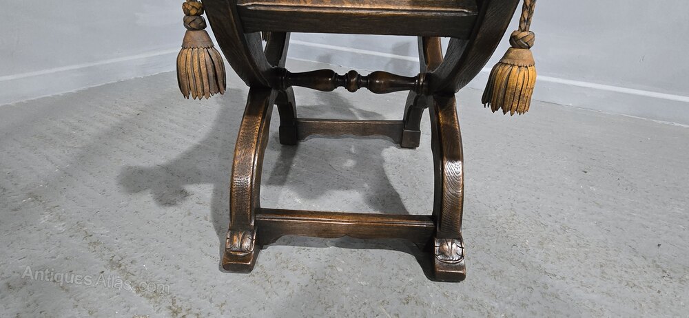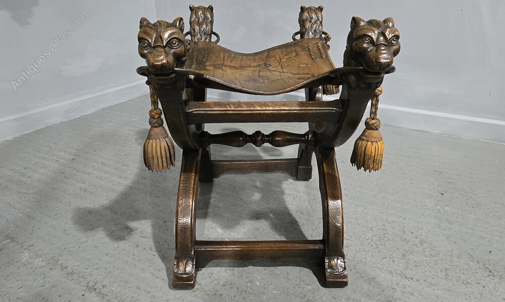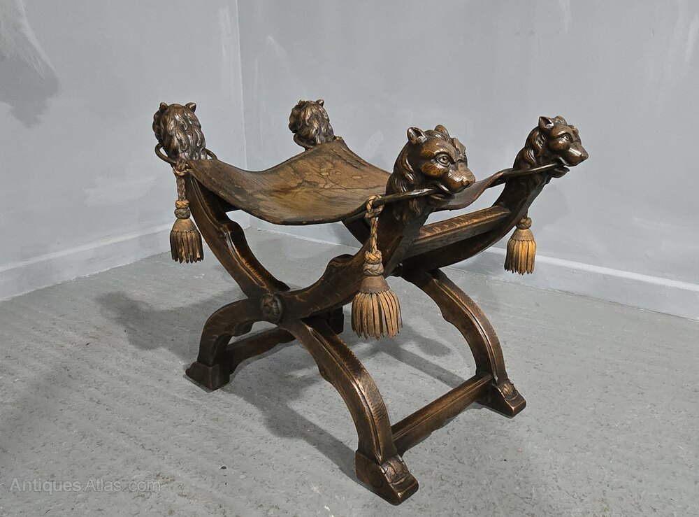 An outstanding Walnut X framed stool with leather seat, carved lion heads holding steel rings with leather tastles, lion paw feet, in overall great condition.