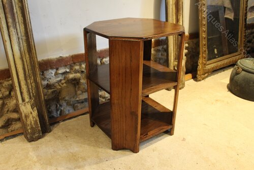 Here we have a great quality Oak table in the manner of Heals c1920. As you can see the table has fantastic colour and patina. The 8 sided top has wonderful grain from the very best solid English Oak with thumb moulded edges to the short sides. The sides extend to feet and there are two internal shelves. Perfect for the side of the settee or for a lamp this versatile table is solid throughout and heavy. A good period table in excellent retail condition ready for your home. The dimensions are approx 45 cm wide 45 cm deep 61 cm high.