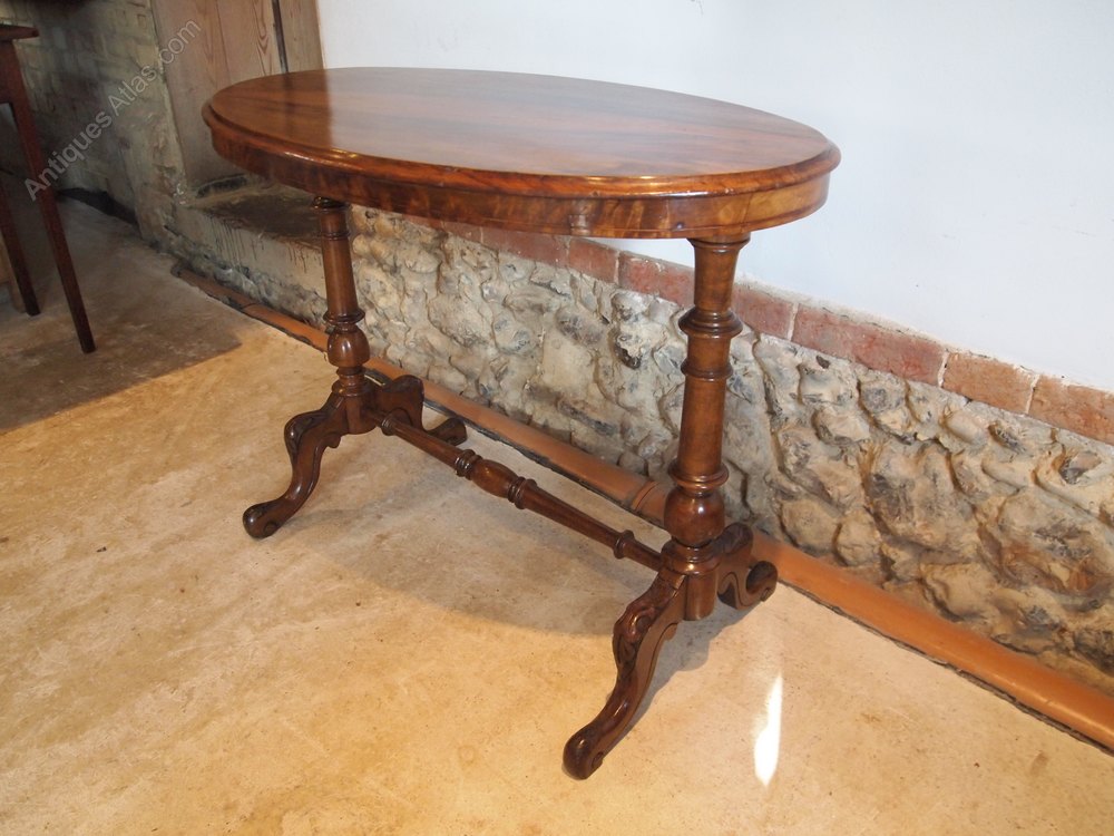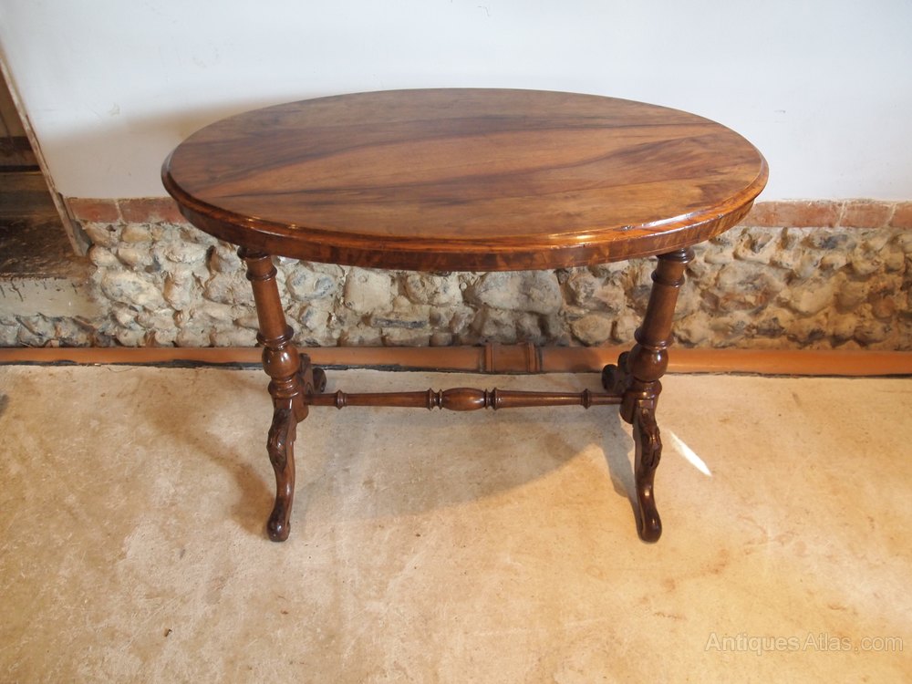 Here we have a fine quality Victorian figured Walnut table c1880. As you can see the table has great colour and patina. The oval top has wonderful figured Walnut veneer and a moulded edge. There is a crossbanded frieze and beautifully carved and shaped legs joined by an H stretcher. A super table in great retail condition ready for your home. The dimensions are approx 35 inches wide 20 deep and 27 high.