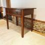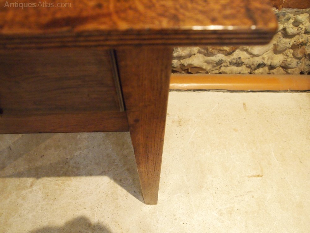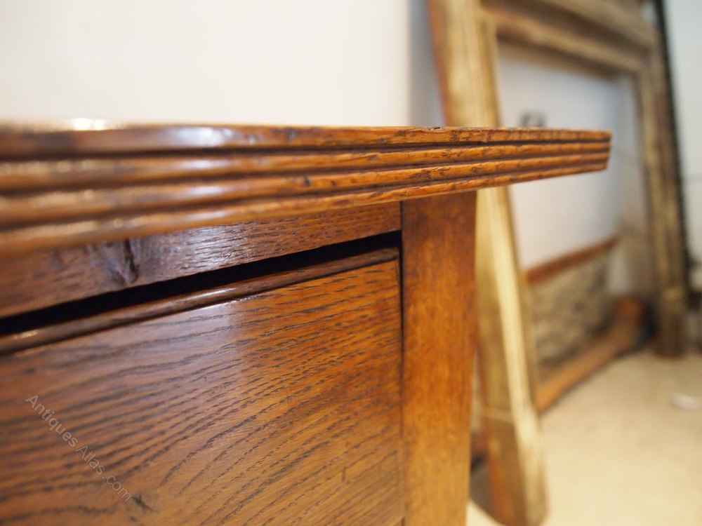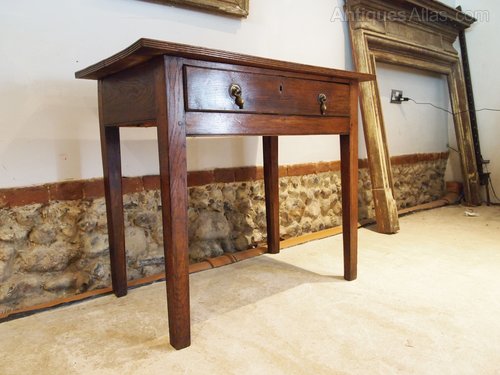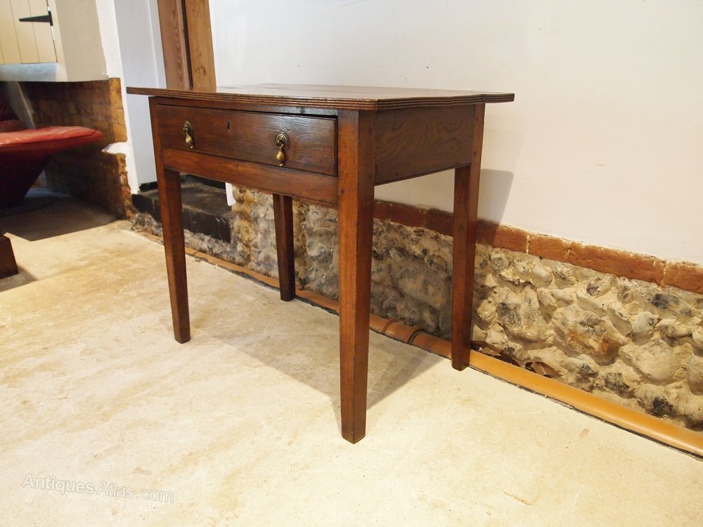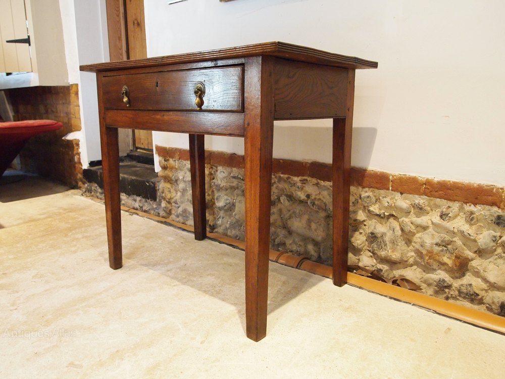 Here we have a wonderful rare Norfolk/Suffolk George III Oak table c1800. As you can see the table has great colour and patina. We know that this table has been in the same family forat least 100 years and possibly since it was made. The table is typical in form of antique tables from this region in having a beautiful reeded edge to the top. This elegant country table has a two plank top with lovely grain and colour. There is a single drawer with brass drop handles and a faux cockbeaded edge. The legs are squared and tapered. A super period table with great regional significance in wonderful retail condition ready for your home. The dimensions are approx 90 cm wide 50 cm deep 74 cm high.