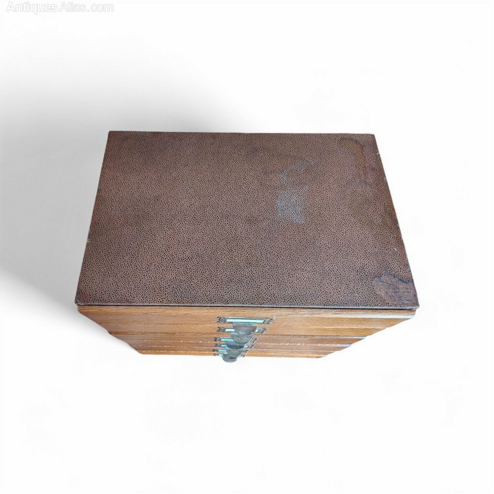 Mid Century tabletop filing cabinet , 6 solid oak fronted drawers easily capable of holding A4 size paper . Wooden frame covered in simulated sharkskin paper showing some marks consistent with age and retaining all 6 original pull handles . A useful piece of kit which is both strong and sturdy .