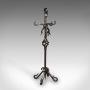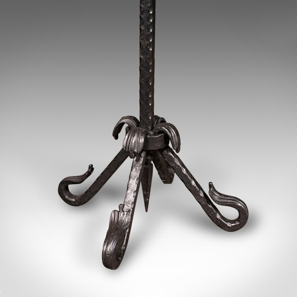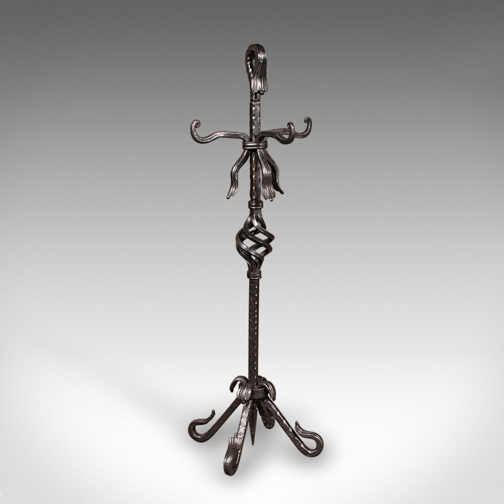 This is a tall antique fireside companion. An English, wrought iron set of fire tools presented upon an ornate stand, dating to the Edwardian period, circa 1910. Neatly arranged and expertly crafted, this fireside set offers enduring utility and classic visual appeal for the traditional hearth.