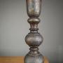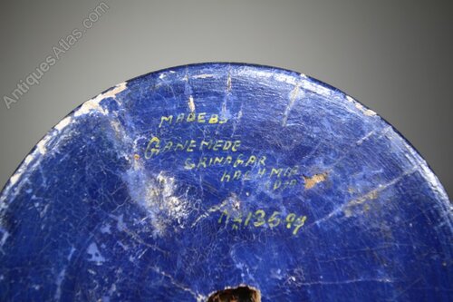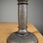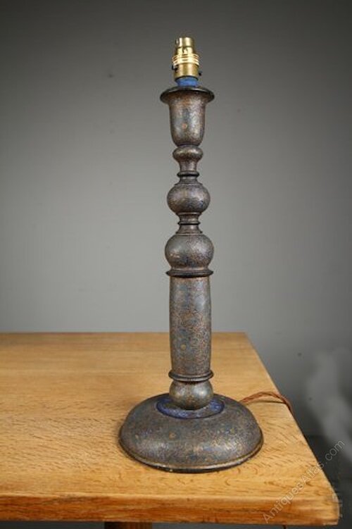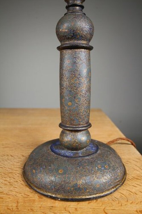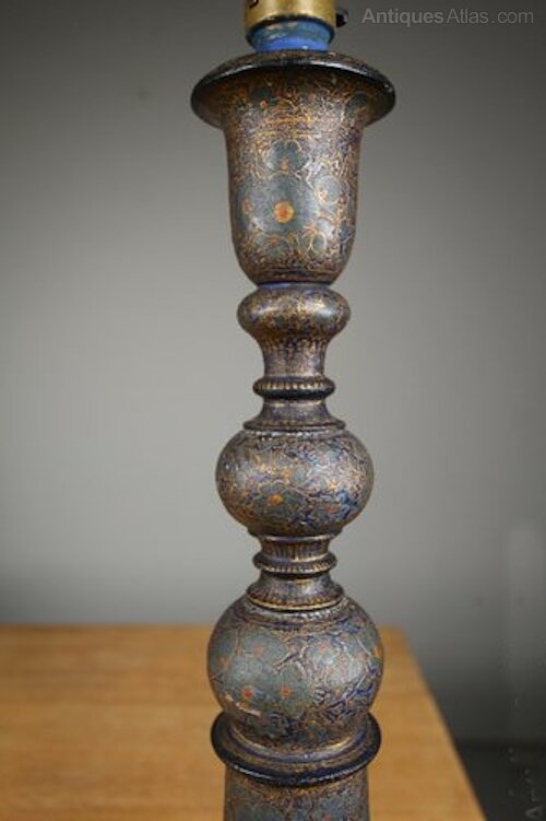 This is a taller example of an early Kashmiri antique table lamp, unusually signed by the maker underneath, Ganemede, Srinagar, Kashmir. In excellent condition and a lovely shape, this Kashmiri antique table lamp has a blue painted background with fine gilt work decorations. In super condition and newly rewired using traditional braided flex. Dates to around 1915.