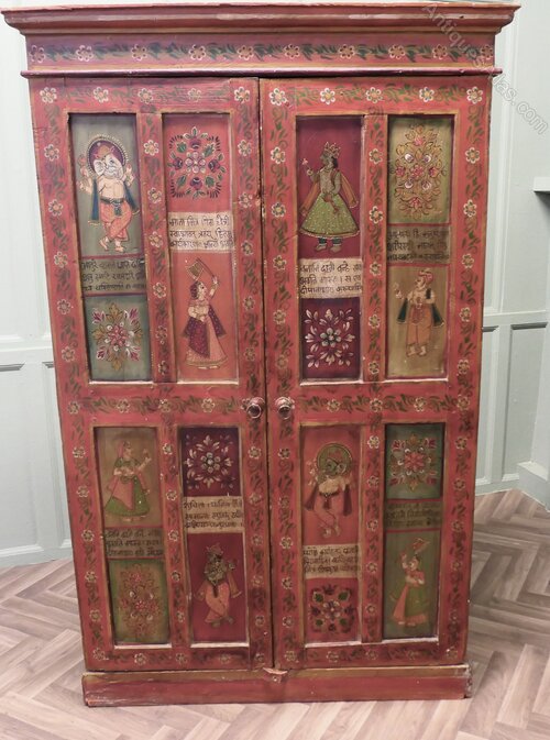 This is a superb piece, the cupboard stands on a small plinth, it is painted in the detailed Indian Folk Art Style showing Immortals and other Characters