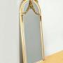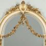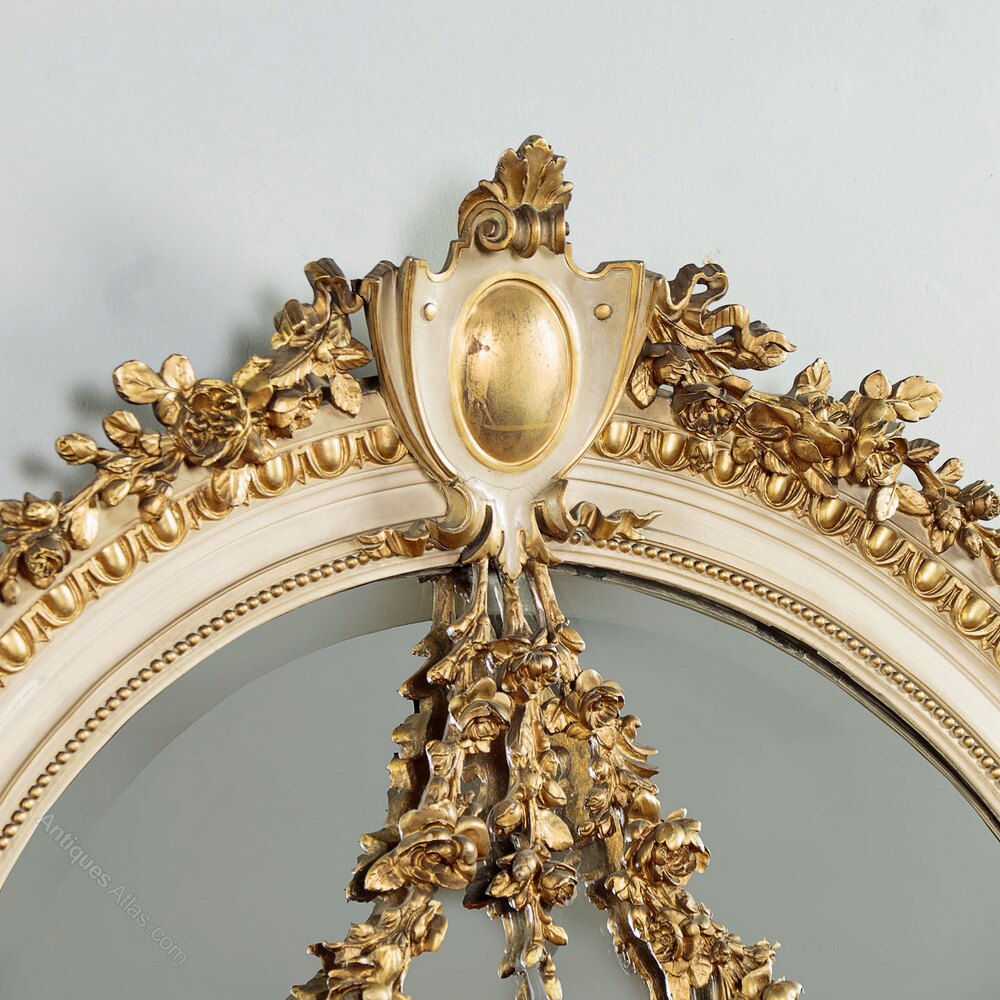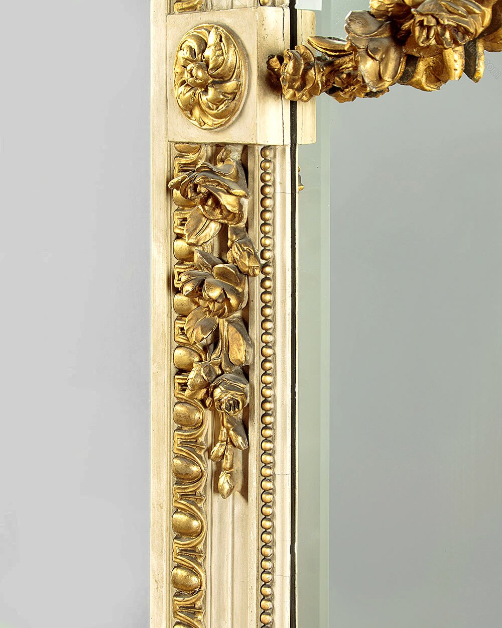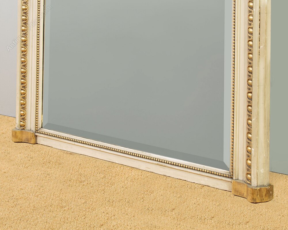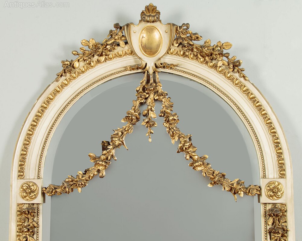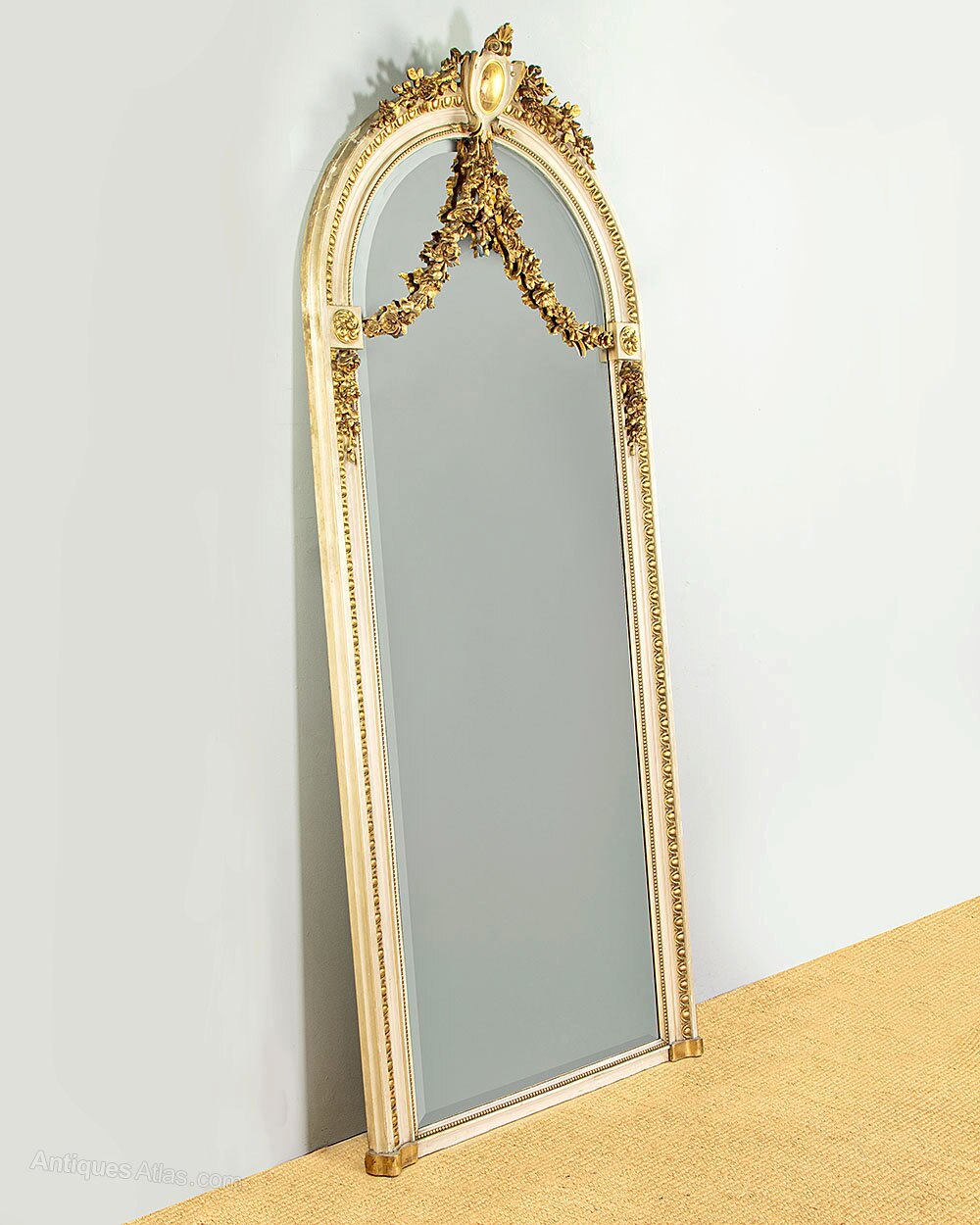 Impressive tall French overmantle mirror or pier glass c.1930. Big enough to use as a full length dressing mirror. 27" x 72.5" arch-top mirror plate with a bevelled edge. In a pale grey painted wooden frame with moulded and gilded gesso decoration. Topped with a shield cartouche with gilded floral garlands to each side and with further garlands draped from it's tip across the upper portion of the glass. Gilded roundels, egg and dart moulding and bead detail to the frame. Very good condition with some retouching. Cleaned and waxed in our workshops.