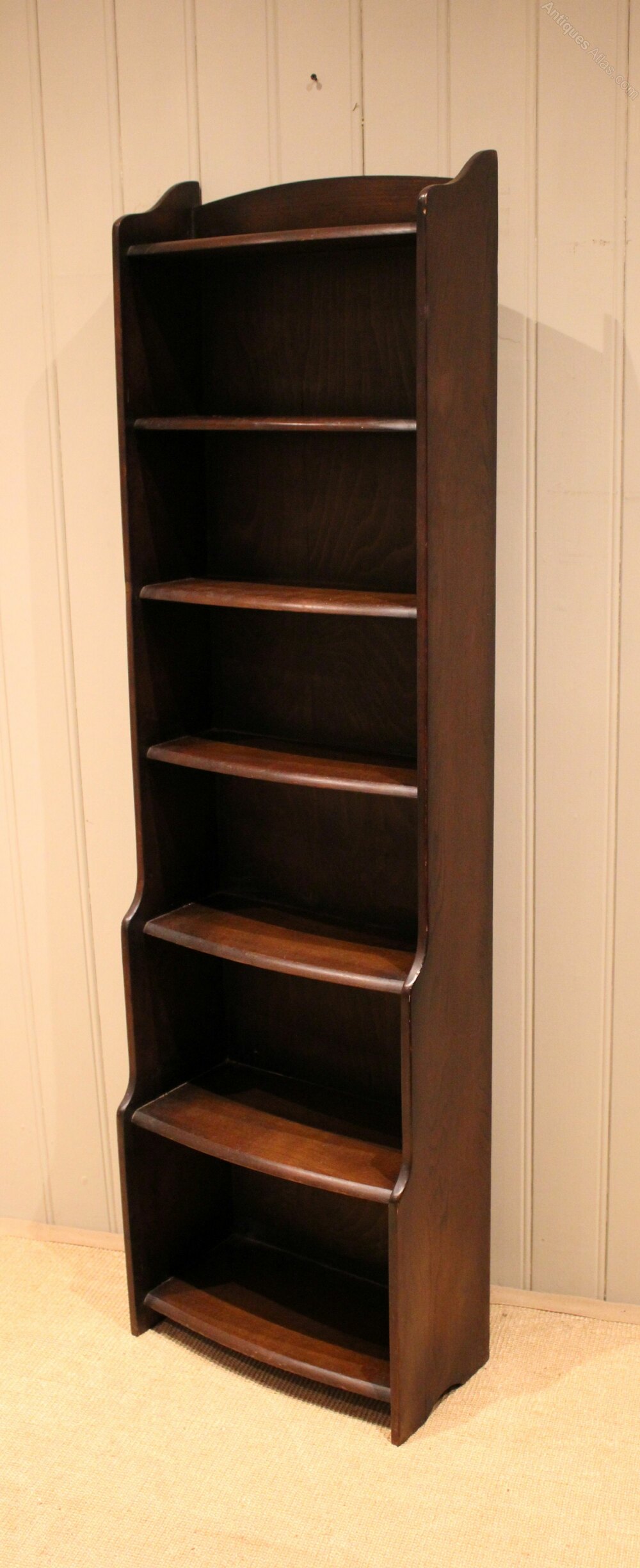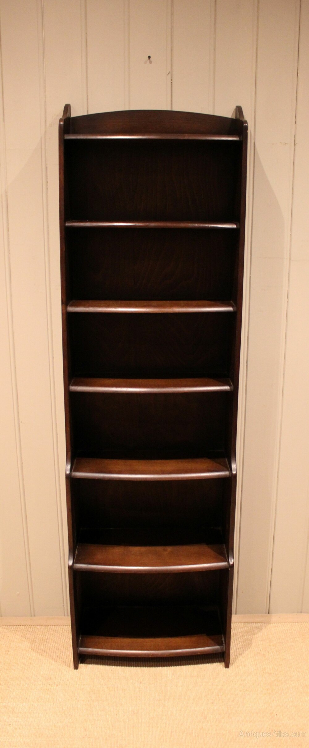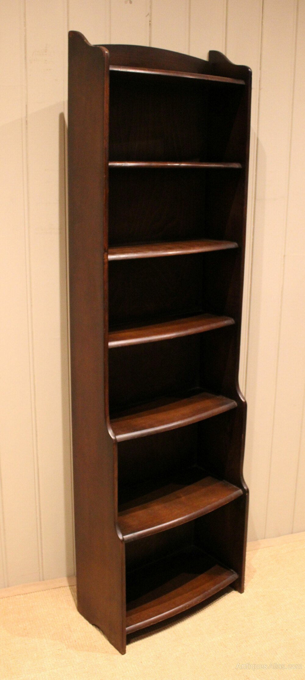 Tall slim oak open bookcase having six fixed graduated bow front graduated shelves with a shaped top , raised on side brackets. The shelf dimensions are 44 cm wide from the bottom up 27.5 cm high x 22 cm deep, 25 cm x 22 cm deep , 23 cm high x 18 cm deep , 20 cm high x 15 cm deep, 20 cm high x cm deep , and at the top 20 cm high x 15 cm deep .
