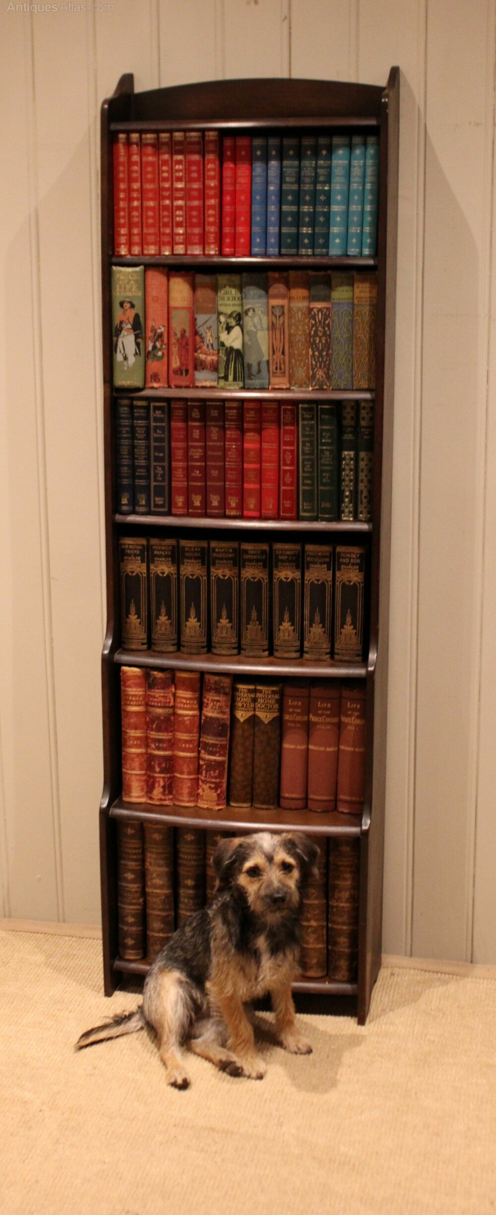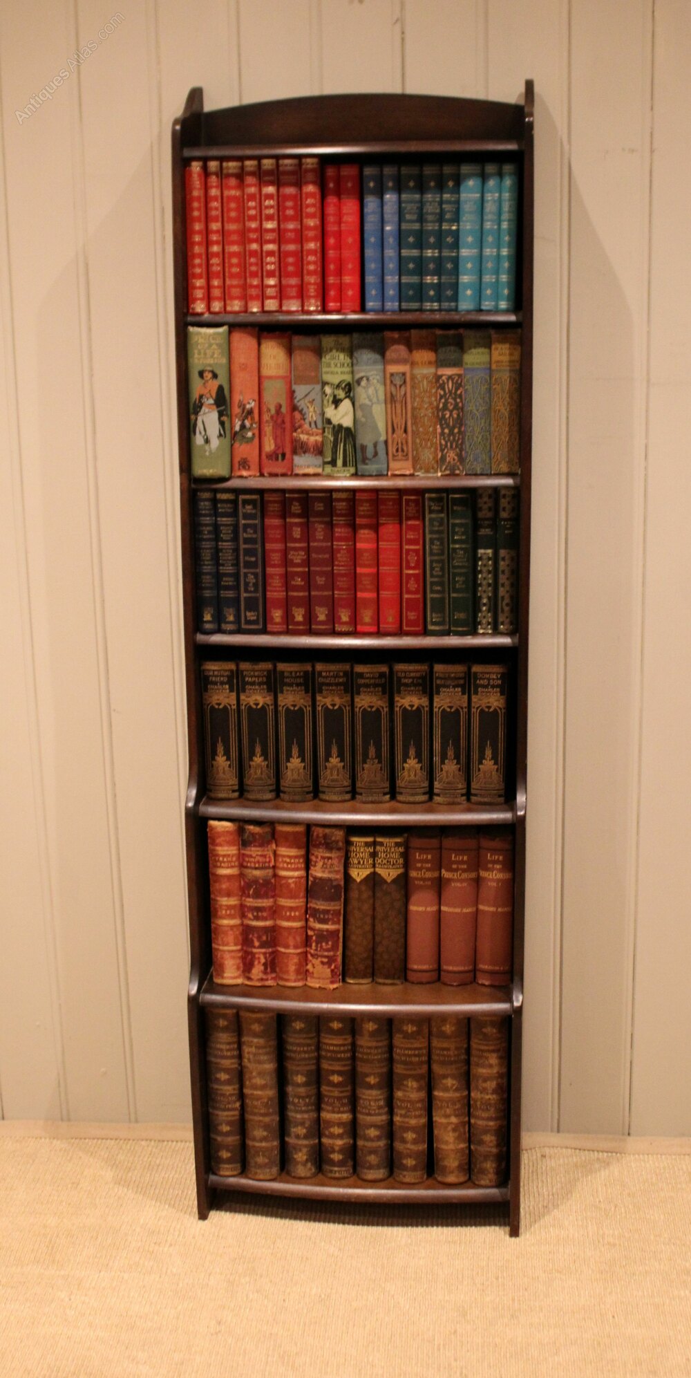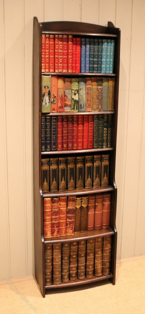 Tall slim oak open bookcase having six fixed graduated bow front graduated shelves with a shaped top , raised on side brackets. The shelf dimensions are 44 cm wide from the bottom up 27.5 cm high x 22 cm deep, 25 cm x 22 cm deep , 23 cm high x 18 cm deep , 20 cm high x 15 cm deep, 20 cm high x cm deep , and at the top 20 cm high x 15 cm deep .
