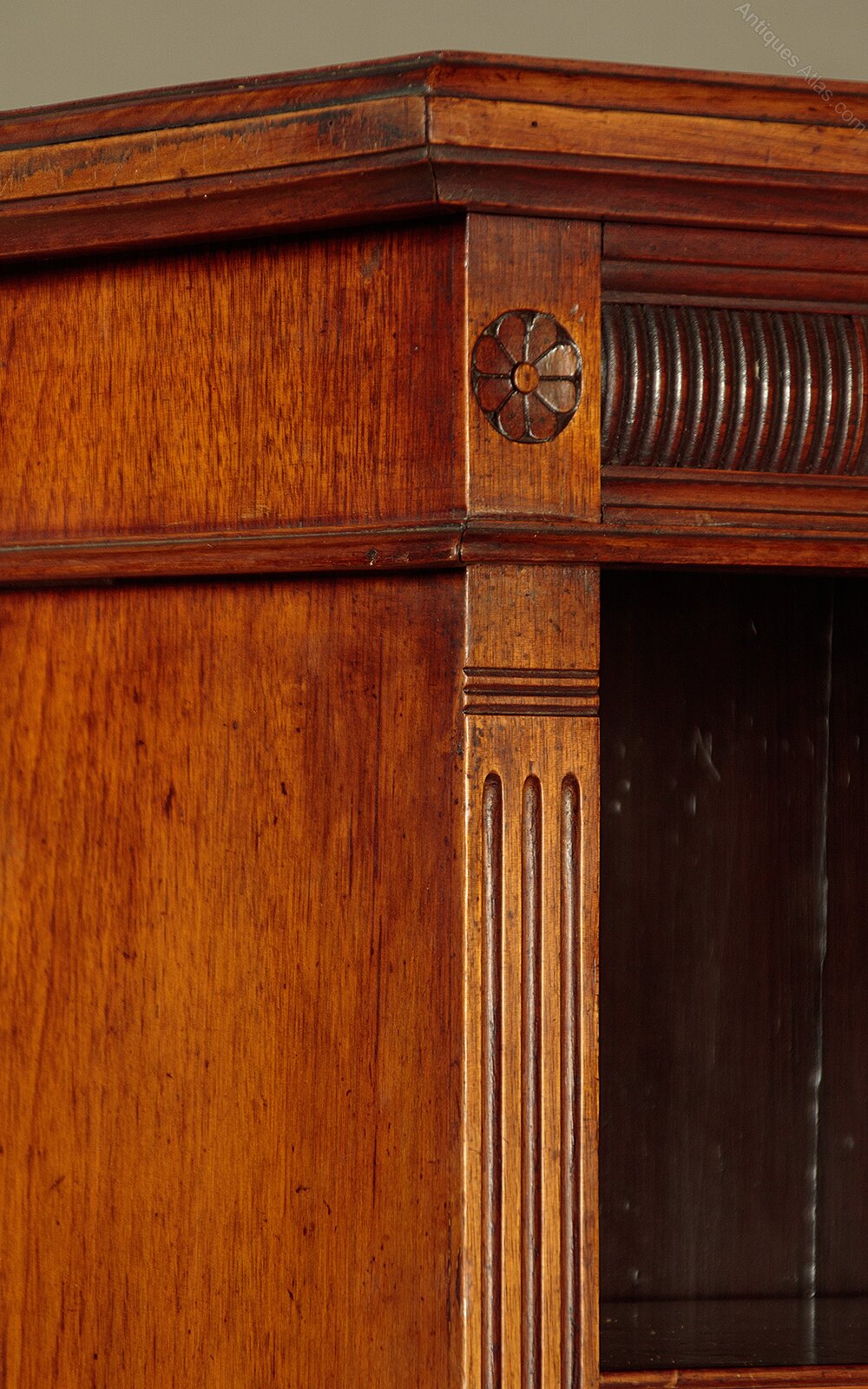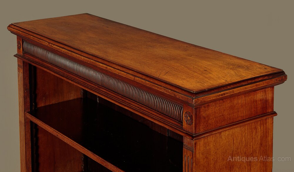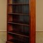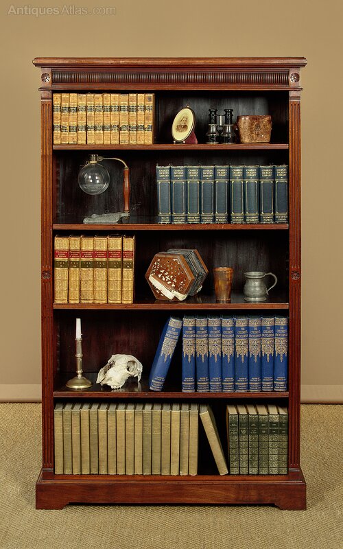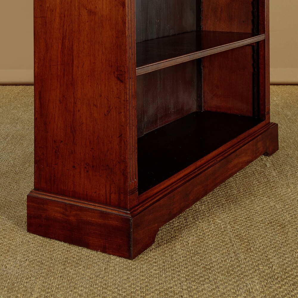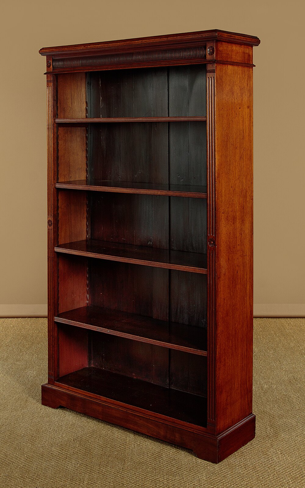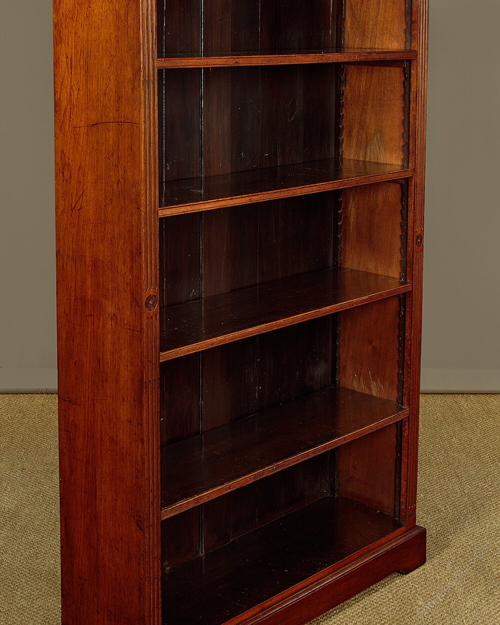 Good looking tall open bookshelves in walnut c.1905. Useful dimensions being five feet tall but just 36" wide. Solid walnut top with a moulded edge over an unusual reeded frieze. Open bookcase with four adjustable shelves (depth 9½") affording over 13 feet of shelf space. Flanked with fluted pilasters carved with flower head roundels. Solid walnut sides, moulded plinth with shaped detail to the feet. Repairs to the veneers on the plinth, otherwise excellent condition, cleaned and waxed in our workshops.