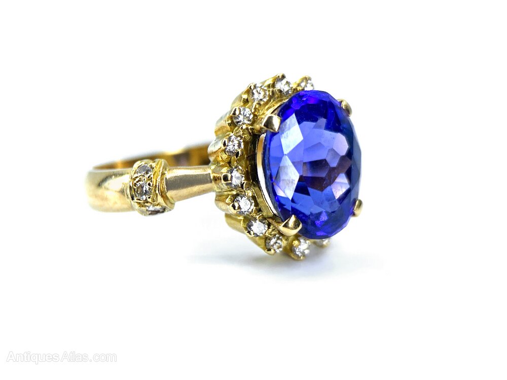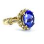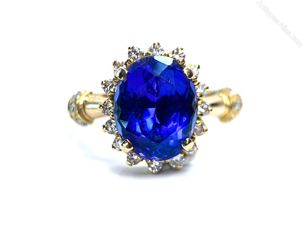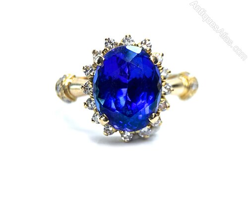This pretty ring has an oval tanzanite approximately 3.55 carats surrounded by 16 diamonds approximately 0.02 carats each and 6 more diamonds on the shoulders approximately 0.01 carats each totalling 0.38 carats. All set in 18 carat yellow gold. The setting measures 12.29 mm x 11.05mm across. The ring size is N 1/2 but we have a superb jeweller who can resize without a trace. Weight 5.94 grams.