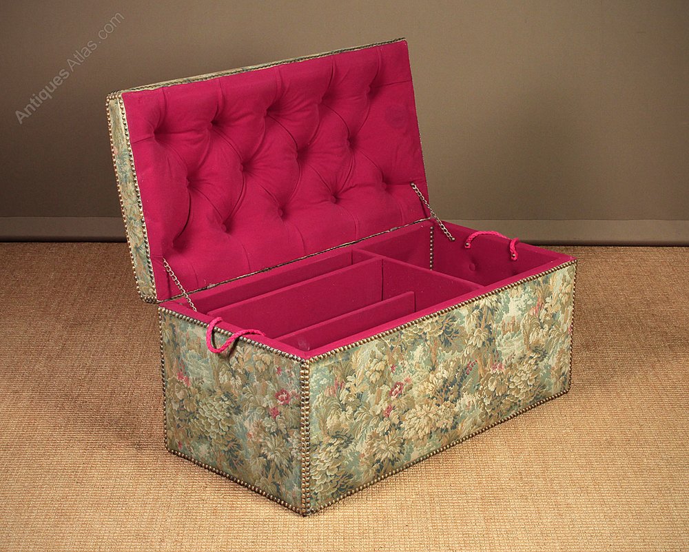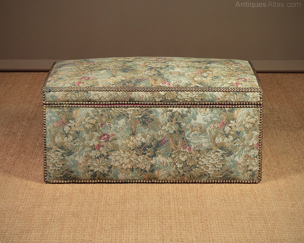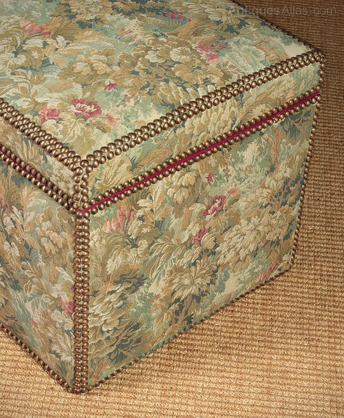 Unusual ottoman or box seat upholstered in a woven verdure tapestry fabric with decorative brass studs to the edges. Lift the lid to reveal a red button upholstered interior fitted with dividers (which could be removed if preferred). Excellent condition.