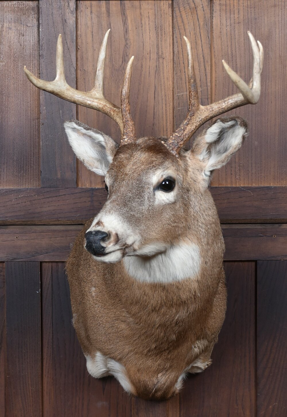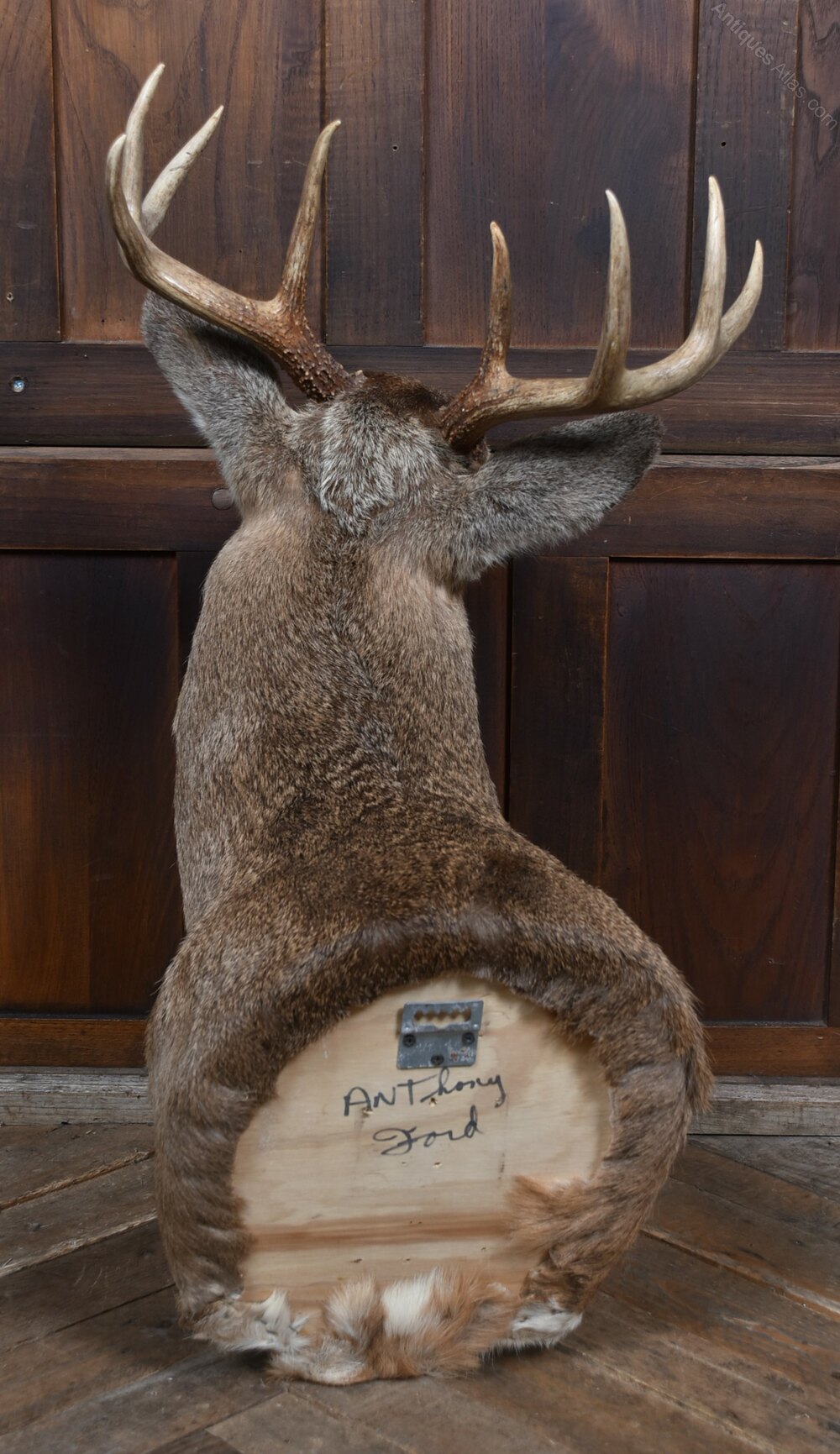 Taxidermy 8‑point white‑tailed deer shoulder mount by Anthony Ford, signed on the reverse. A well‑executed piece of taxidermy, displaying a natural, alert expression and a good, even coat. The antlers have a strong, symmetrical formation with eight clean points, giving the mount real presence on the wall.