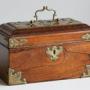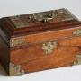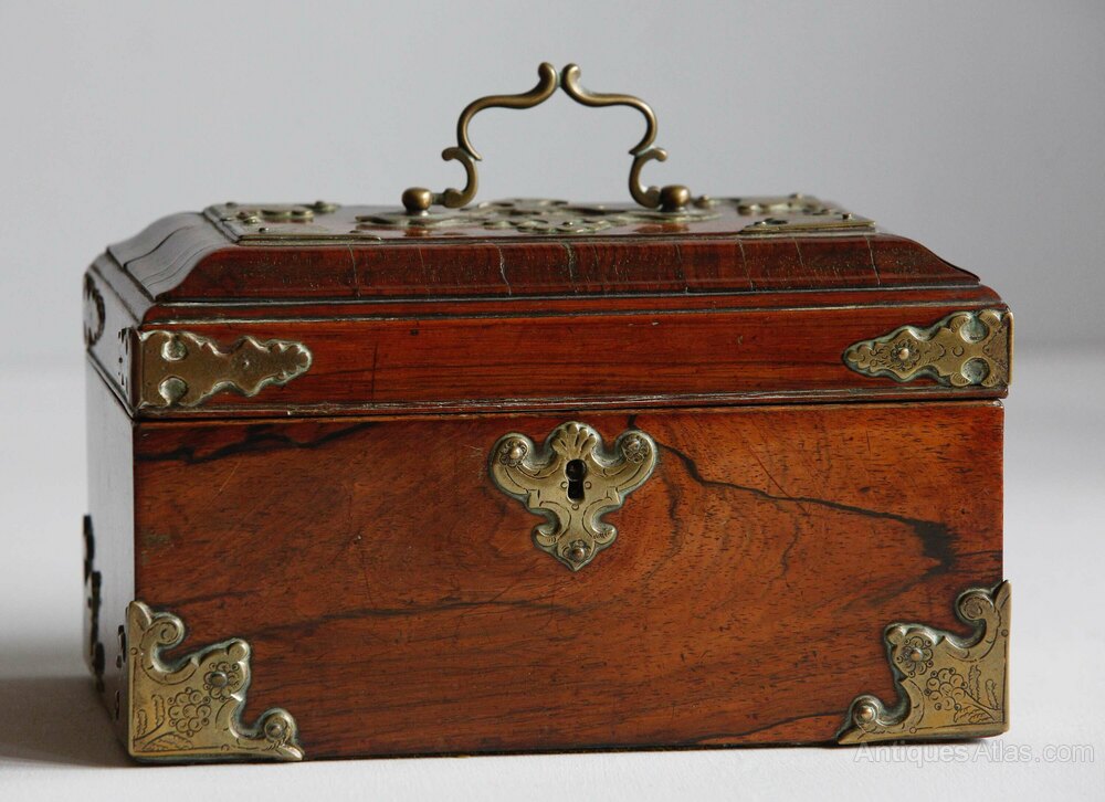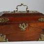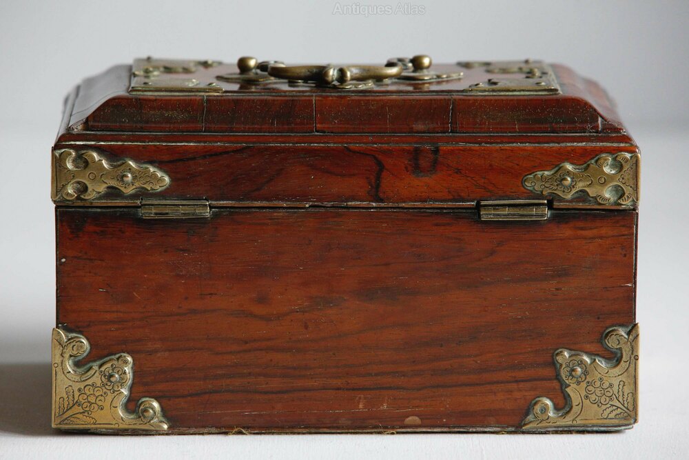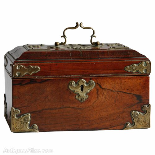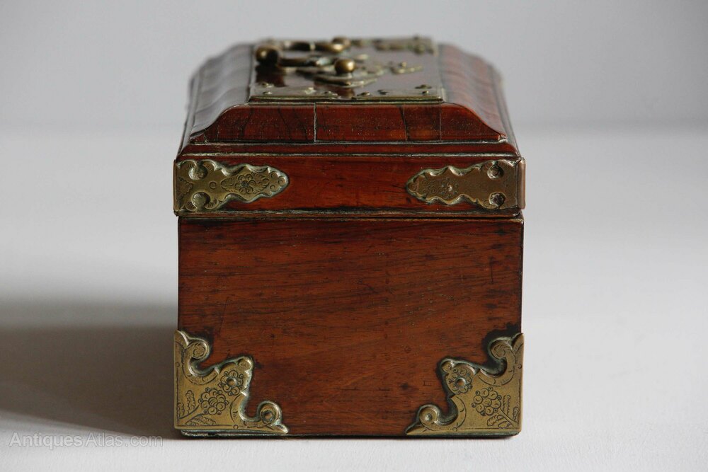 Fine example of a George II brass metal mounted padouk tea caddy with finely etched and wrought hardware and vivid grain, color and patina.