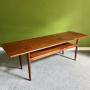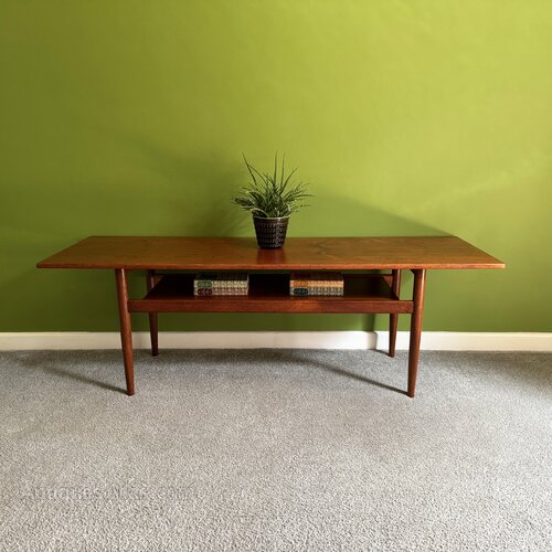 A quality teak coffee table dating from the 1960s, with solid legs and a useful under-shelf. Measuring almost 5' wide, it makes a handsome focal point for your room.