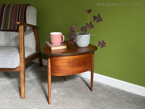 This 1960s table is cute as a button! Designed originally as sewing storage, it has been relined in green and now works beautifully as an end table, perfect for a lamp or to rest your cup. Inside, there's room to store bits and pieces neatly out of sight. Made of teak, it has a lovely warm colour and grain.