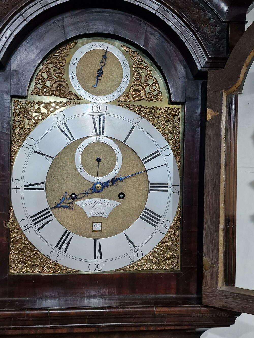 A very impressive and elegant Georgian London mahogany longcase clock. A fine quality case with an arched pediment and detailed fretwork. Choice flame mahogany case veneers. Brass capped hood columns and side glass hood panels. A raised moulded base panel. A superb brass and silvered dial with blued steel hands with strike/silent to the arch. A seconds and date dial with 'Tho Goddard, London' engraved to the cartouche on the dial. An 8-day duration, 5 pillar mechanism striking the hours on a bell. Original brass cased weights. Circa 1770.
