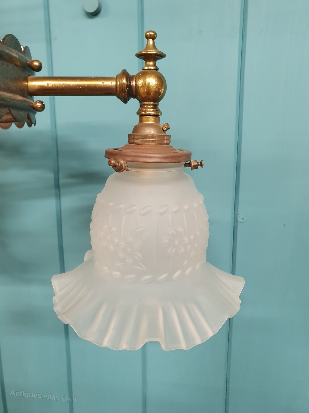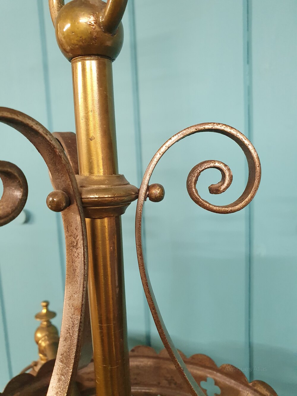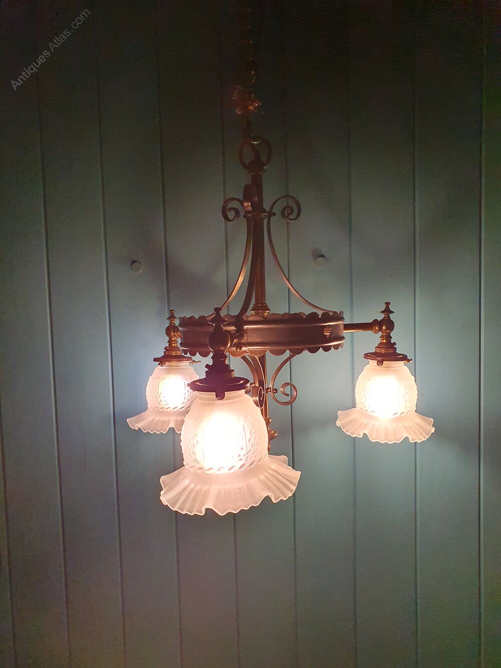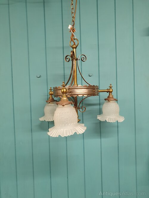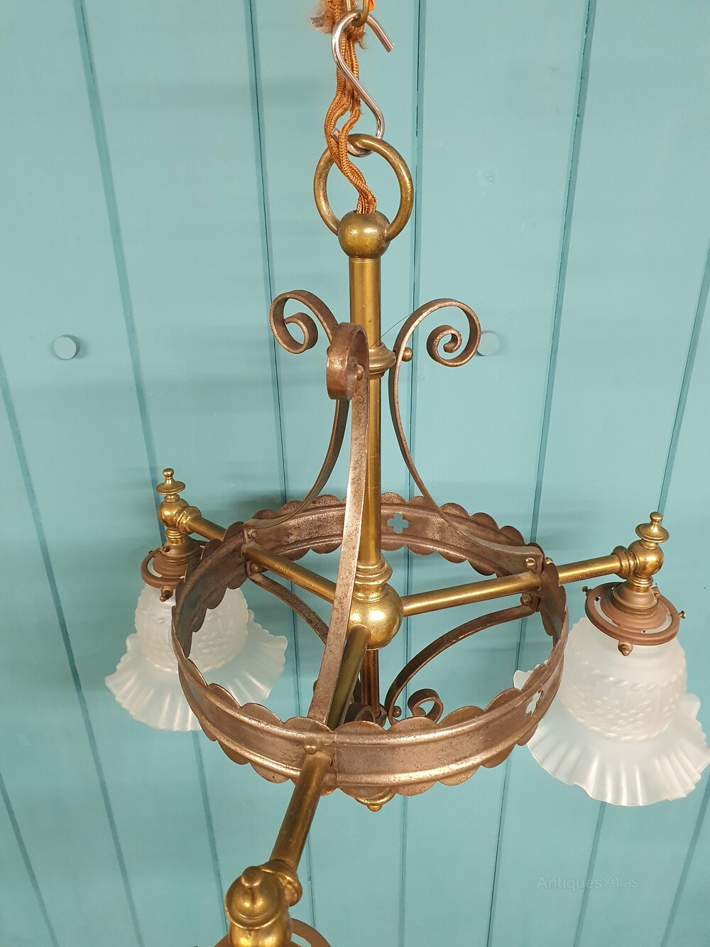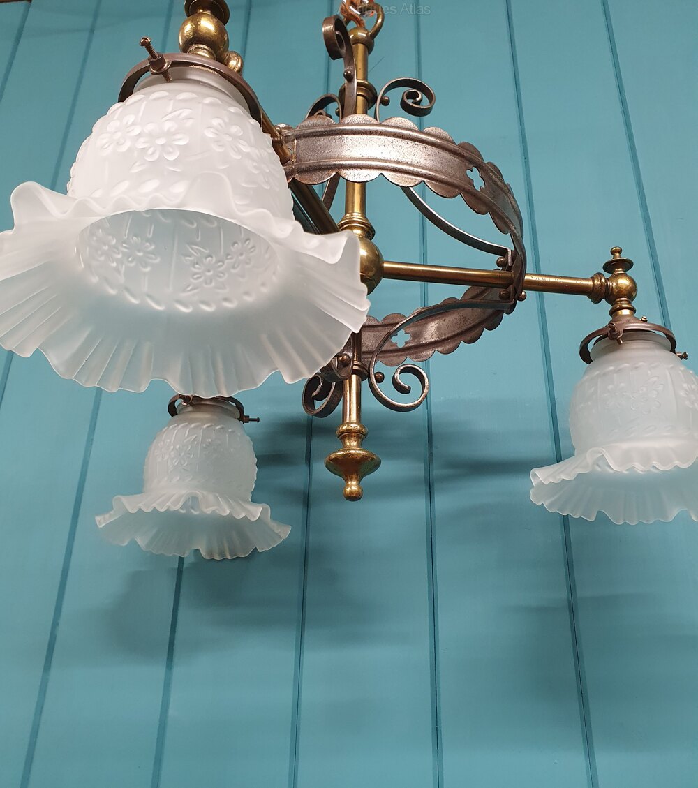 Three-arm coronet-shaped chandelier constructed from steel, brass and glass. The central column is brass with steel C-scroll detailing. The centre section has a frilled coronet-style gallery with pierced quatrefoil decoration. The three arms are in the form of original gas fittings and are finished with finials at the tops. The glass shades are decorated with floral detailing and have a frilled lower edge. The width is measured across the outer edges of the glass shades. Fitted with B22 (large bayonet) bulb holders.