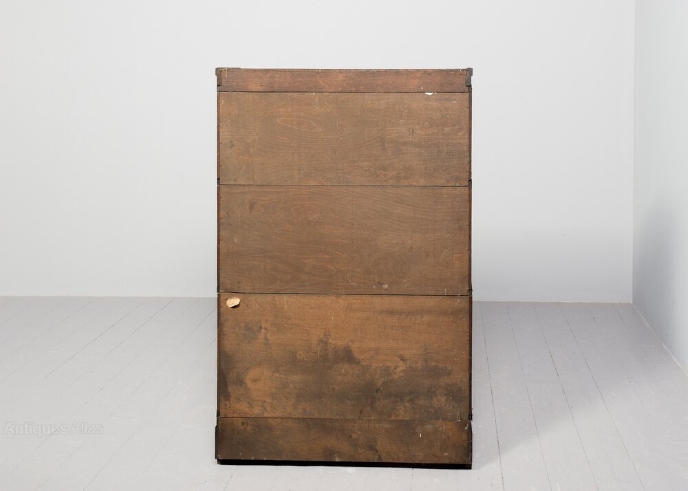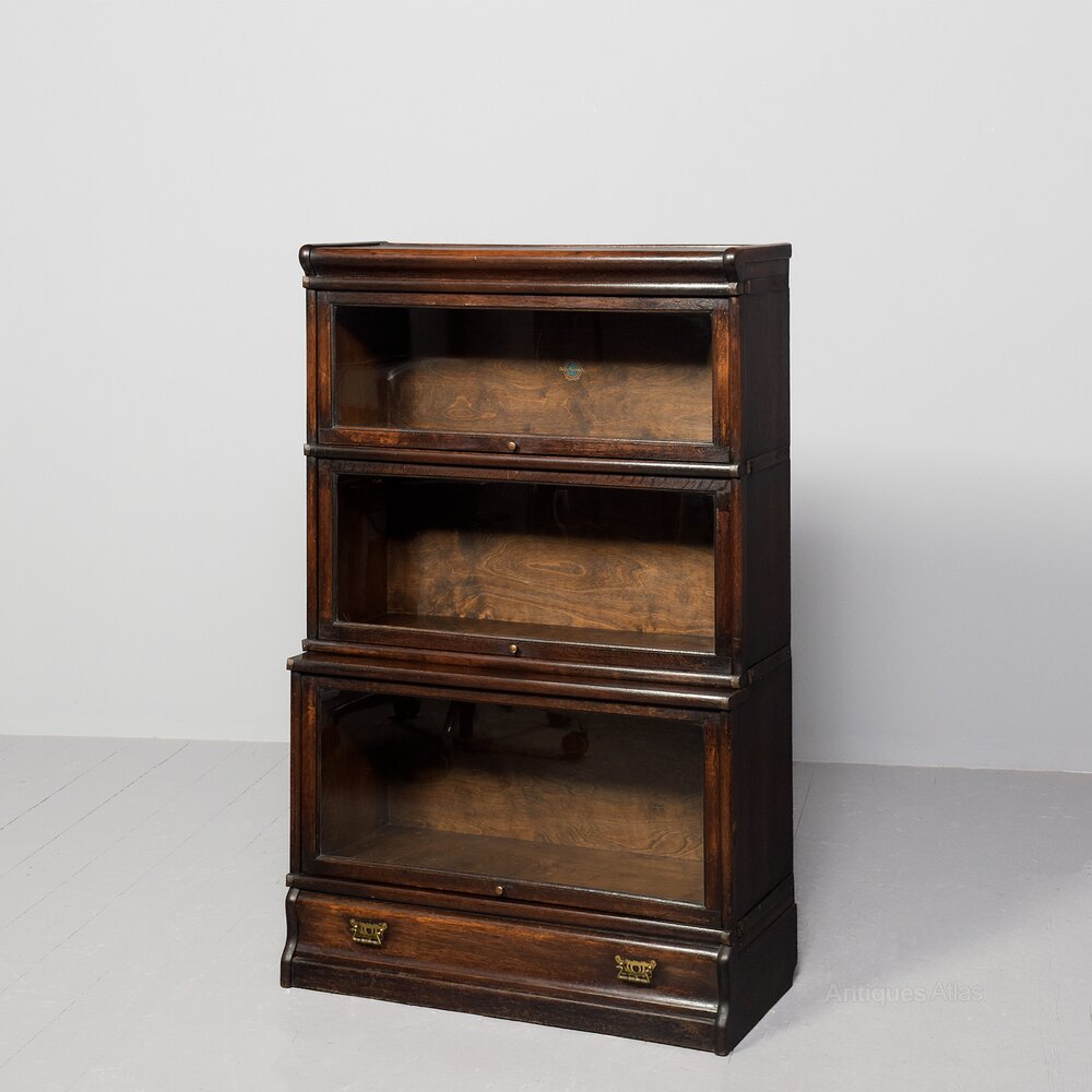 Circa 1920. Three-section Globe Wernicke oak section bookcase. The polished top with a rounded fore-edge over the three glazed bookcase sections, with a deeper section on the base above a drawer with original brass handles. Lovely colour and patina and in excellent condition.