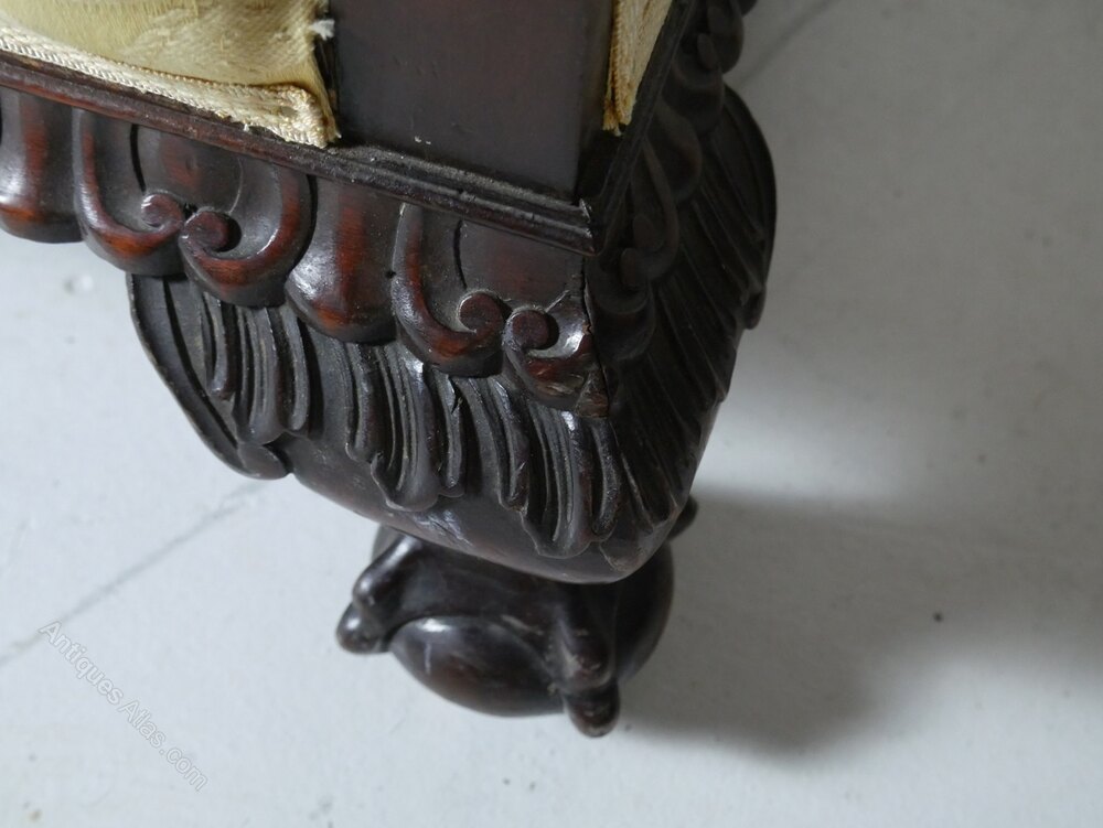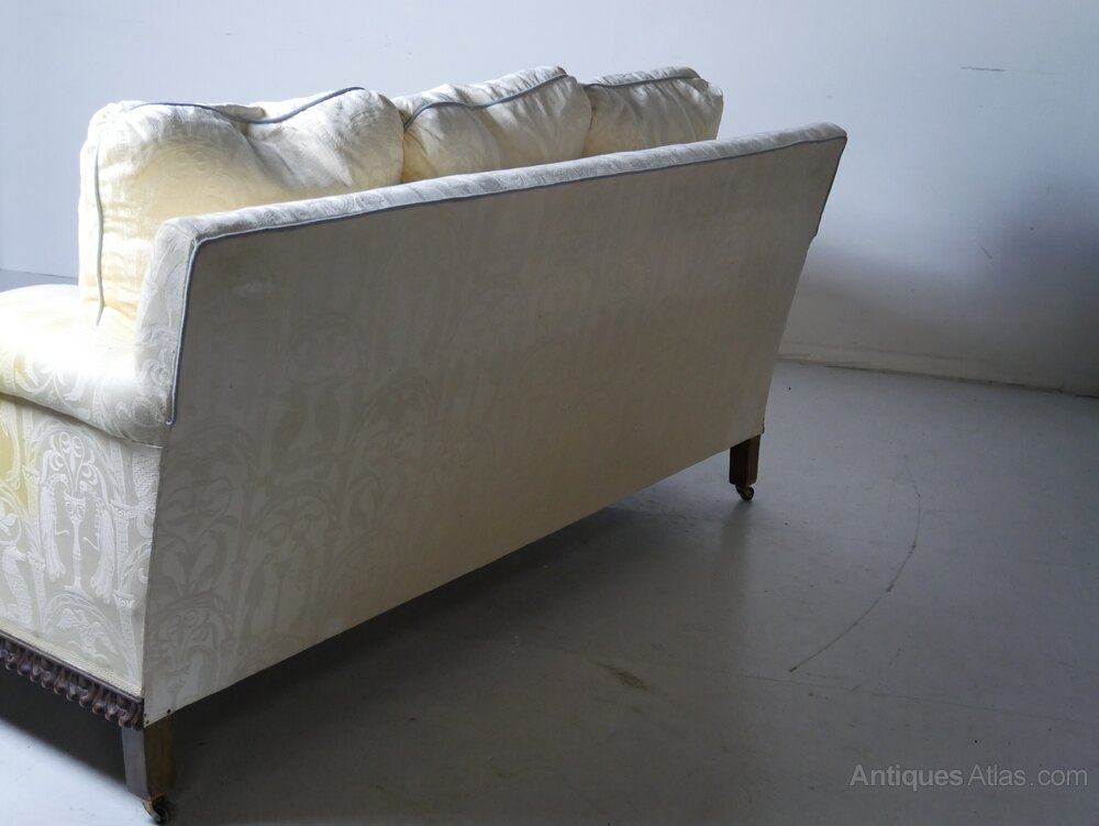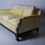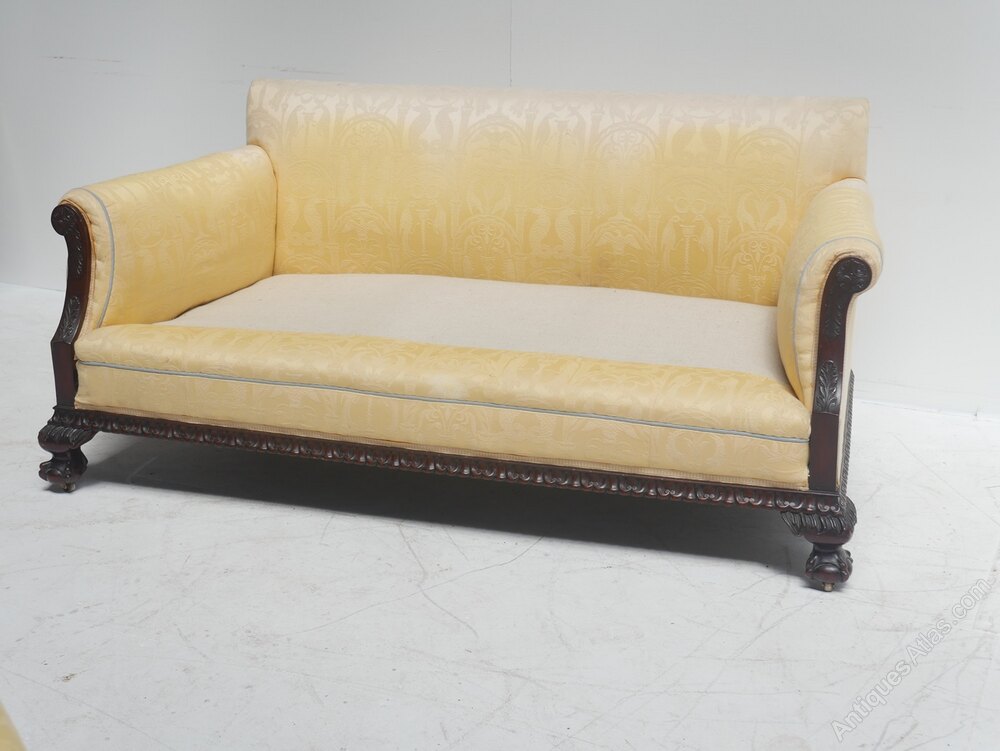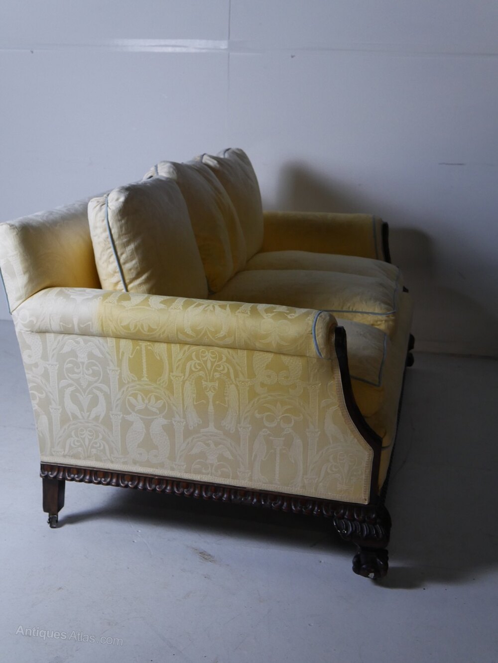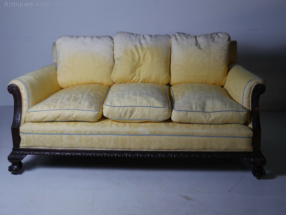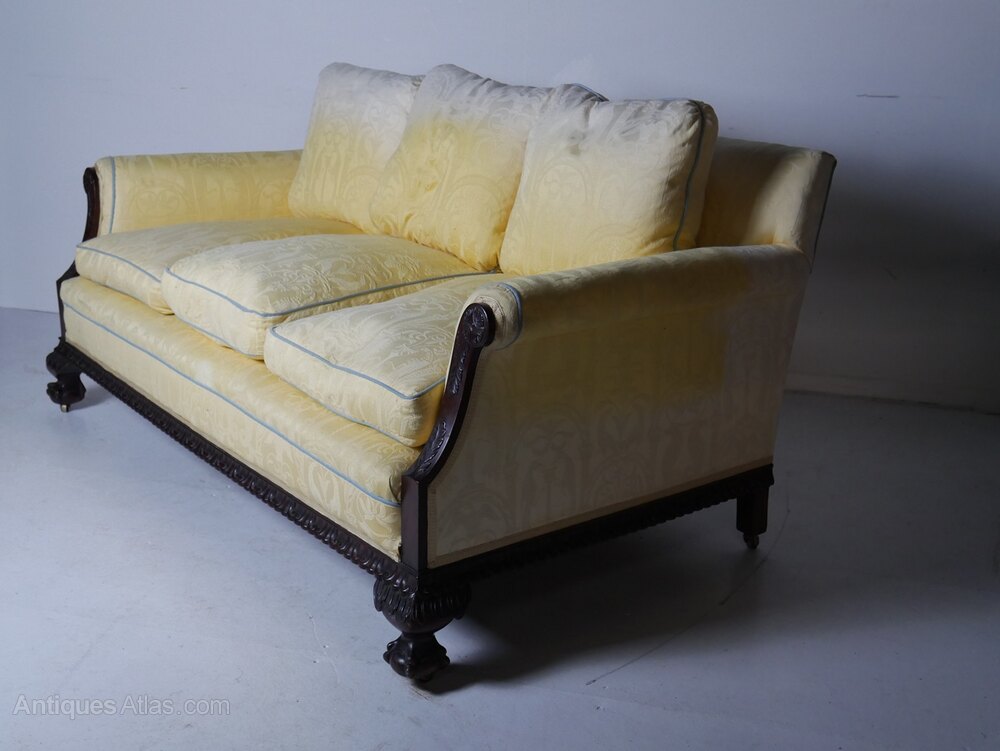 A good quality three seater sofa with loose cushions to the seat and the back. A well carved mahogany frame with claw and ball front legs. A comfortable sofa, well faded in parts, all in good strong condition with a seating height of 49cm. Dated around 1900.