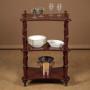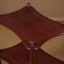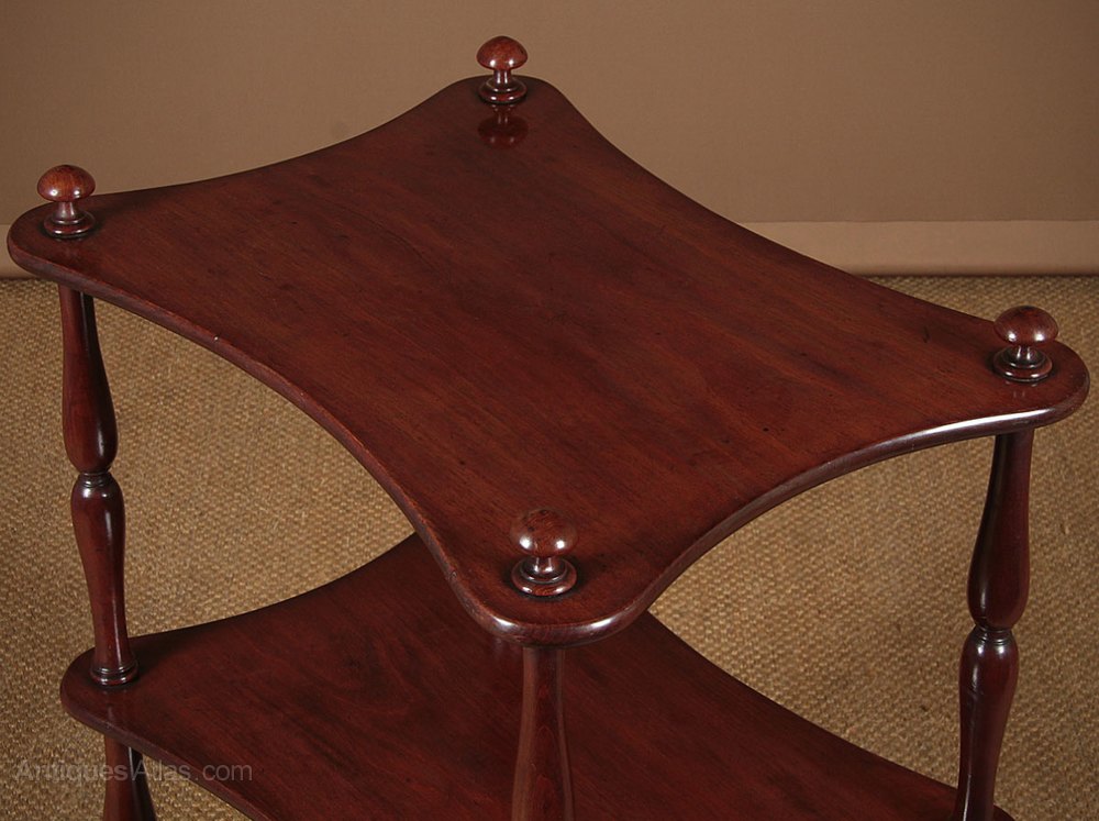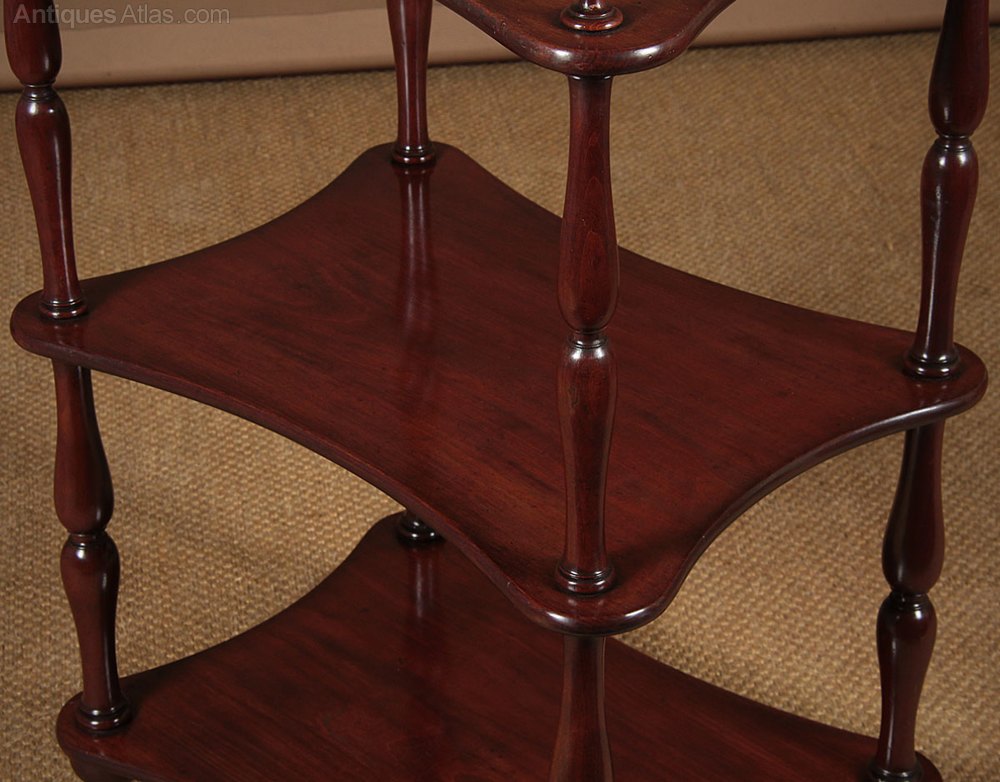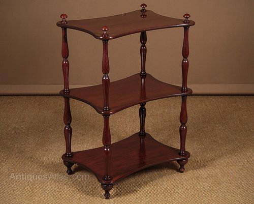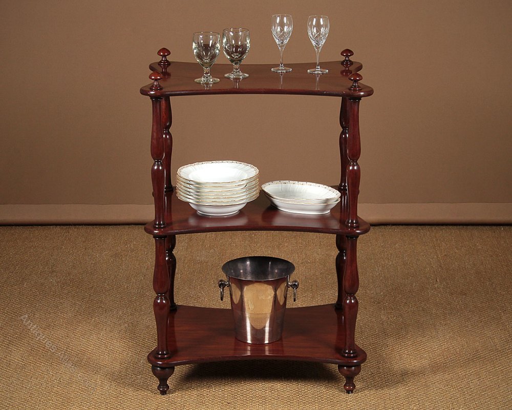 Useful little three tier mahogany stand or dumb waiter c.1850. Just 24″ wide. Three solid mahogany shelves with unusual serpentine edges raised on crisply turned mahogany columns with lovely turned finials and feet. Height between the shelves is 14″. Excellent colour and condition, cleaned and waxed in our workshops.