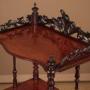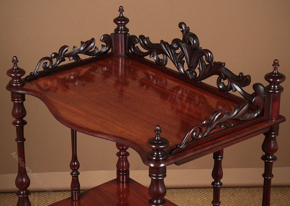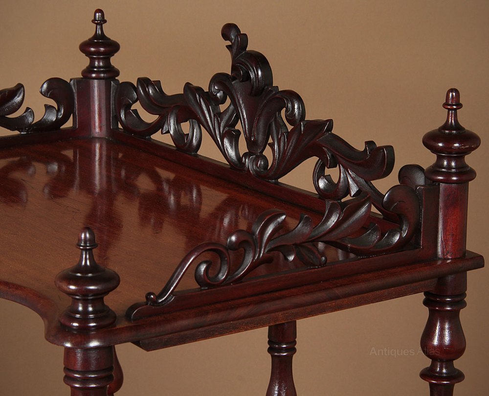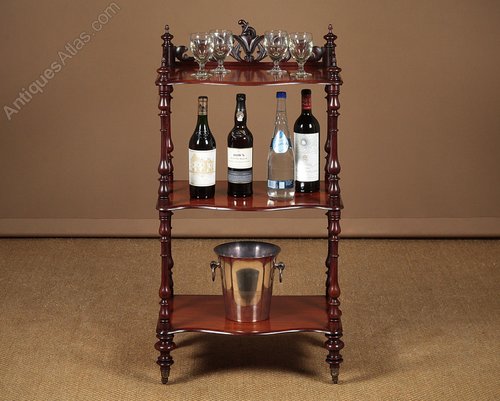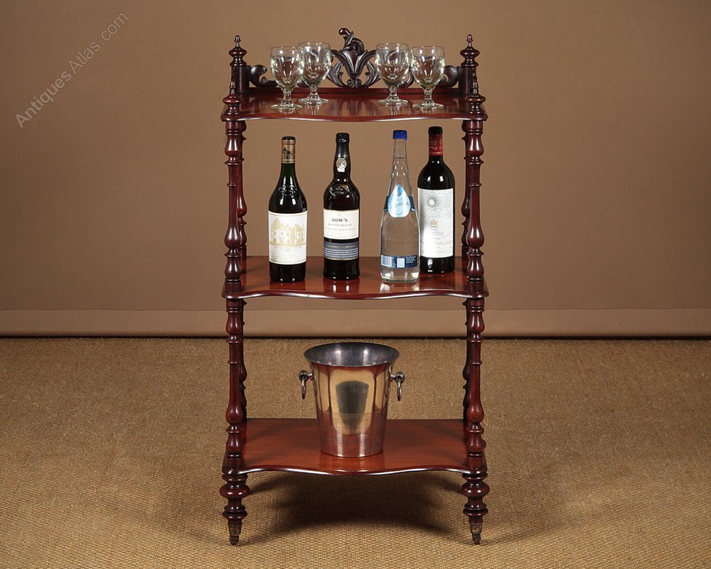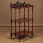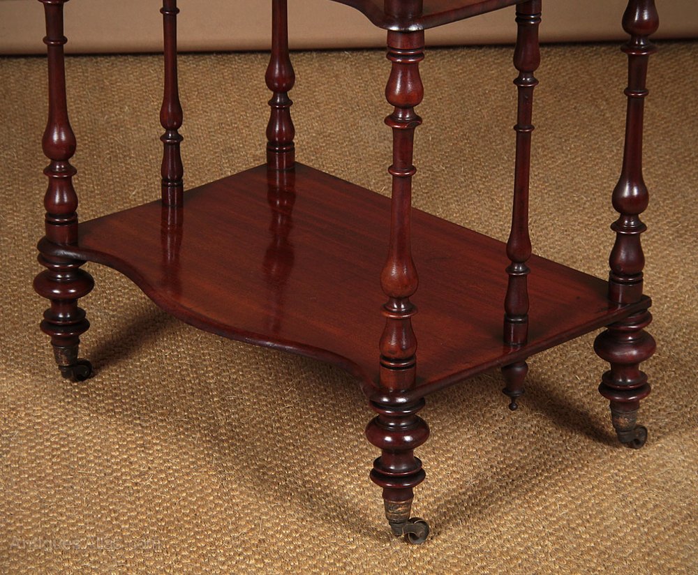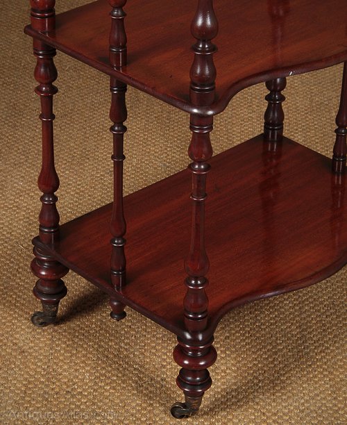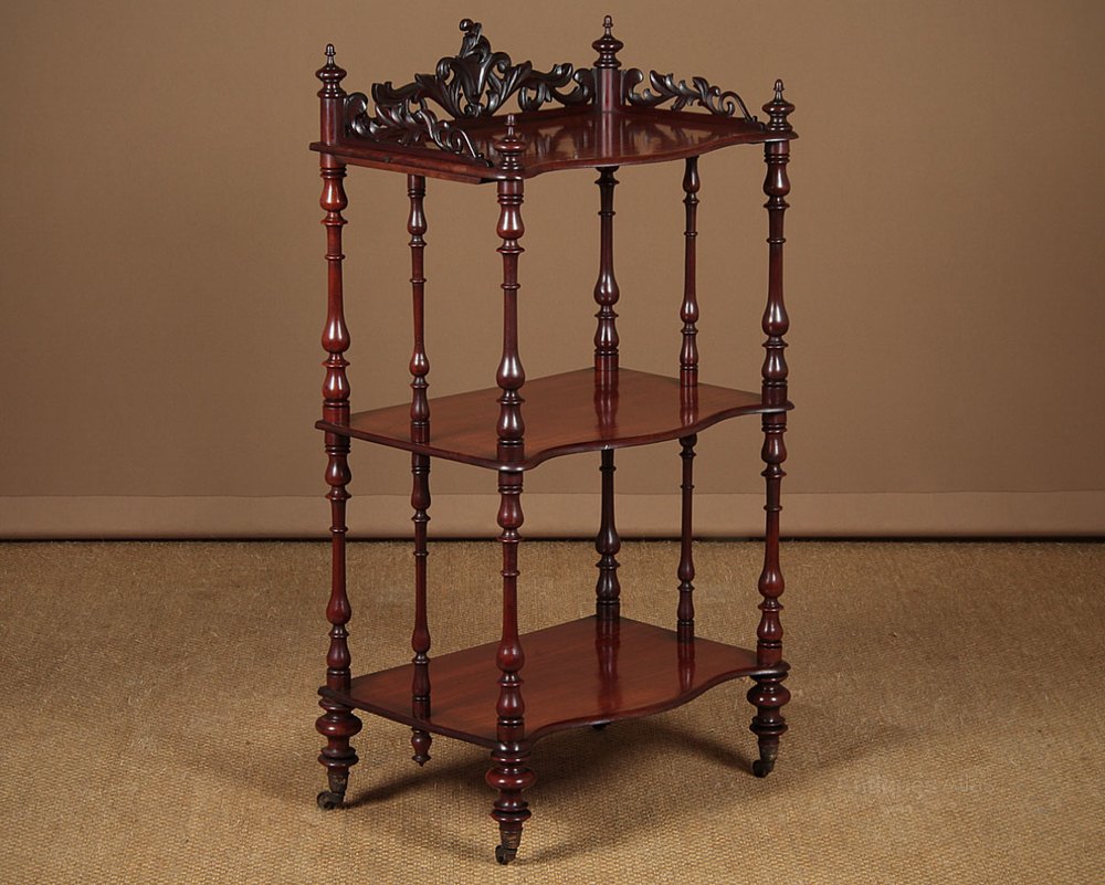 Fine quality little mid 19th.c. mahogany dumb waiter or whatnot c.1860. Three solid mahogany shelves with serpentine front edges raised on slim turned columns with additional supports to the sides. Fine carved and pierced foliate pattern gallery to the top shelf with turned finials. Turned feet with the original brass castors. Excellent colour and condition, cleaned and waxed in our workshops.