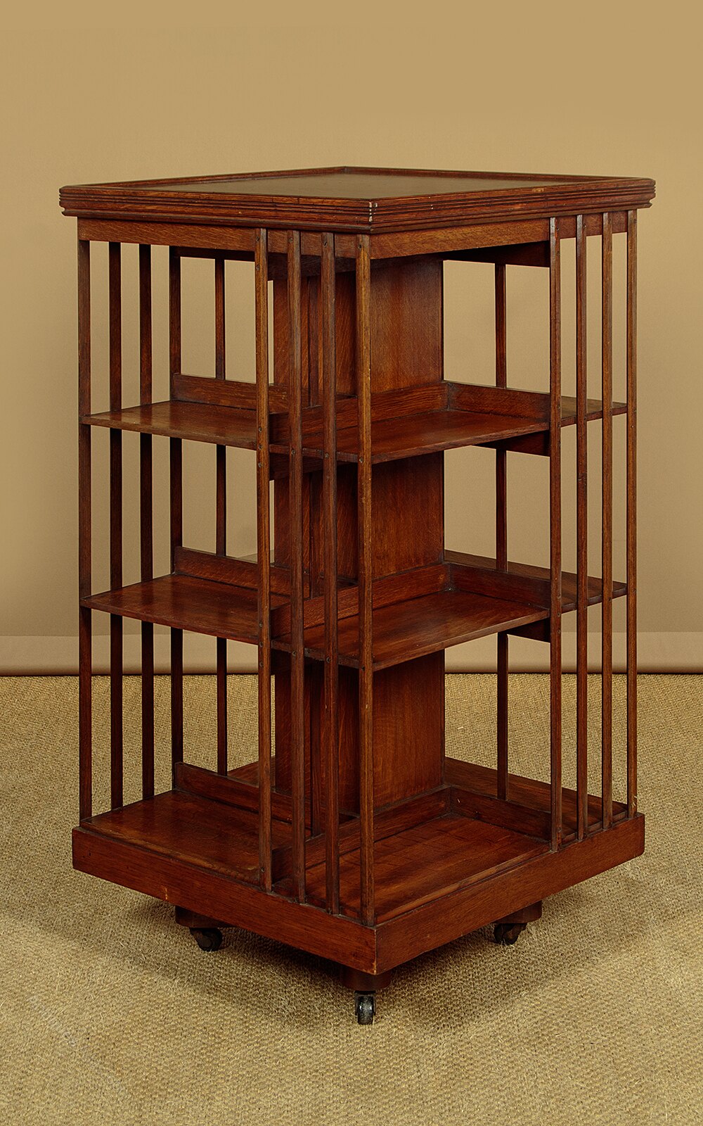 Splendid three tier Edwardian oak revolving bookcase c.1905. With a slightly raised and moulded edge to the top to prevent items from falling of the sides. Over 12 shelves (depth 7") affording over 14 feet of space for books etc. Chamfered slats to the sides and a square plinth. Revolving on a crossed foot raised on the original black ceramic castors. Stamped E.W Beglar on the underside of the foot. Very good colour and condition, cleaned and waxed in our workshops.