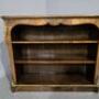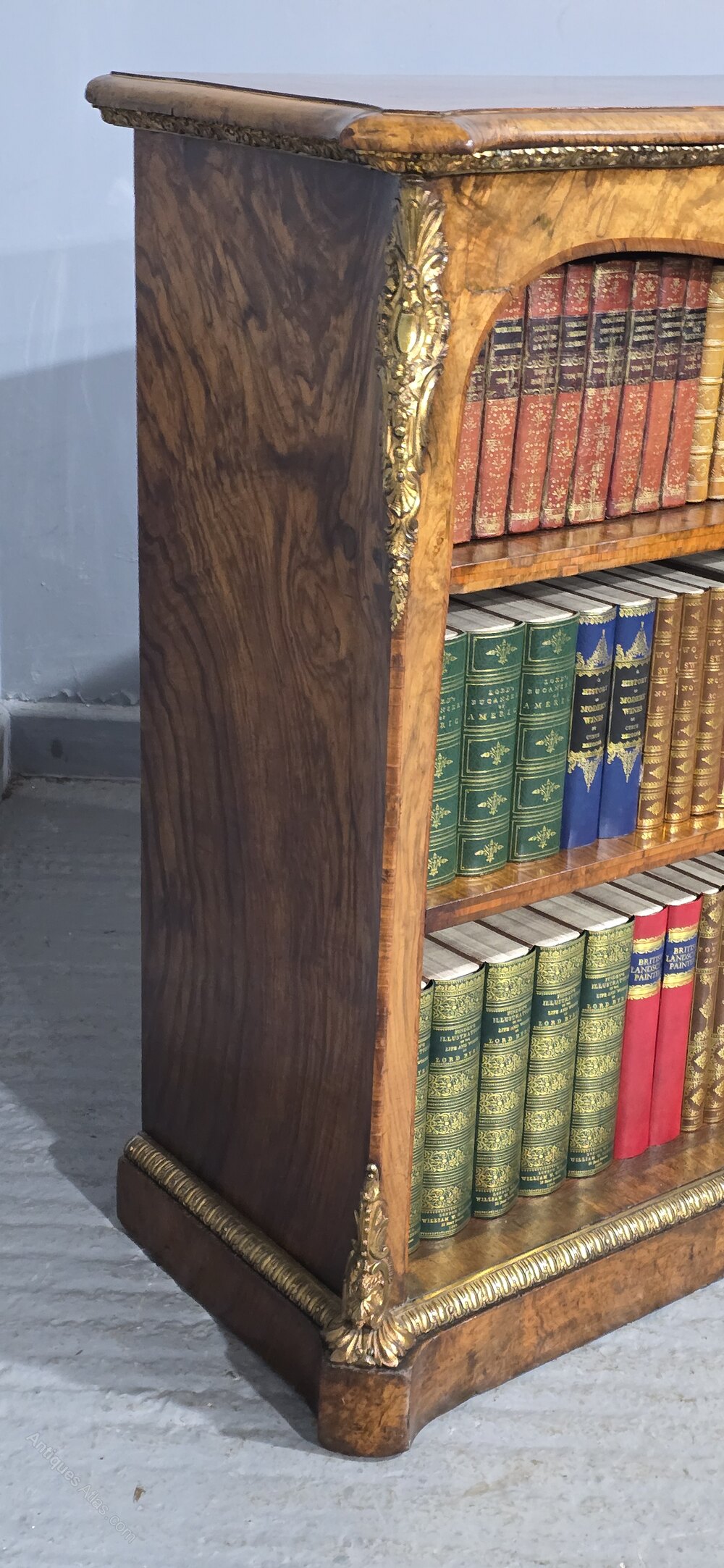 Superb quality English figured walnut concave sided and ormolu mounted open adjustable library bookcase, two adjustable shelves, in overall very good condition.