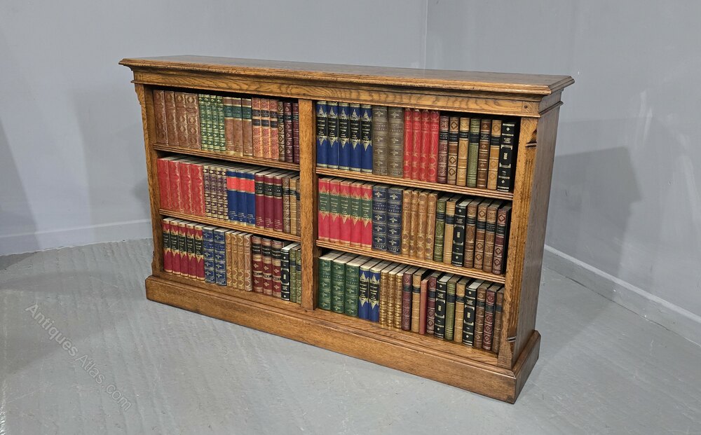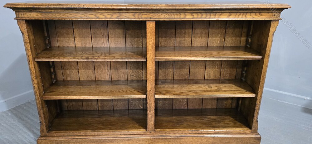 A superb quality solid golden oak open adjustable library bookcase with four shelves, in excellent overall condition.