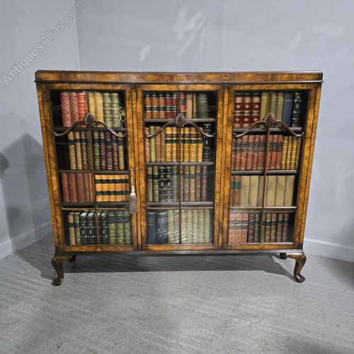 Fine quality Queen Anne figured walnut three door library bookcase, nine adjustable mahogany shelves with brass shelf supports, in excellent overall condition.