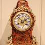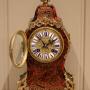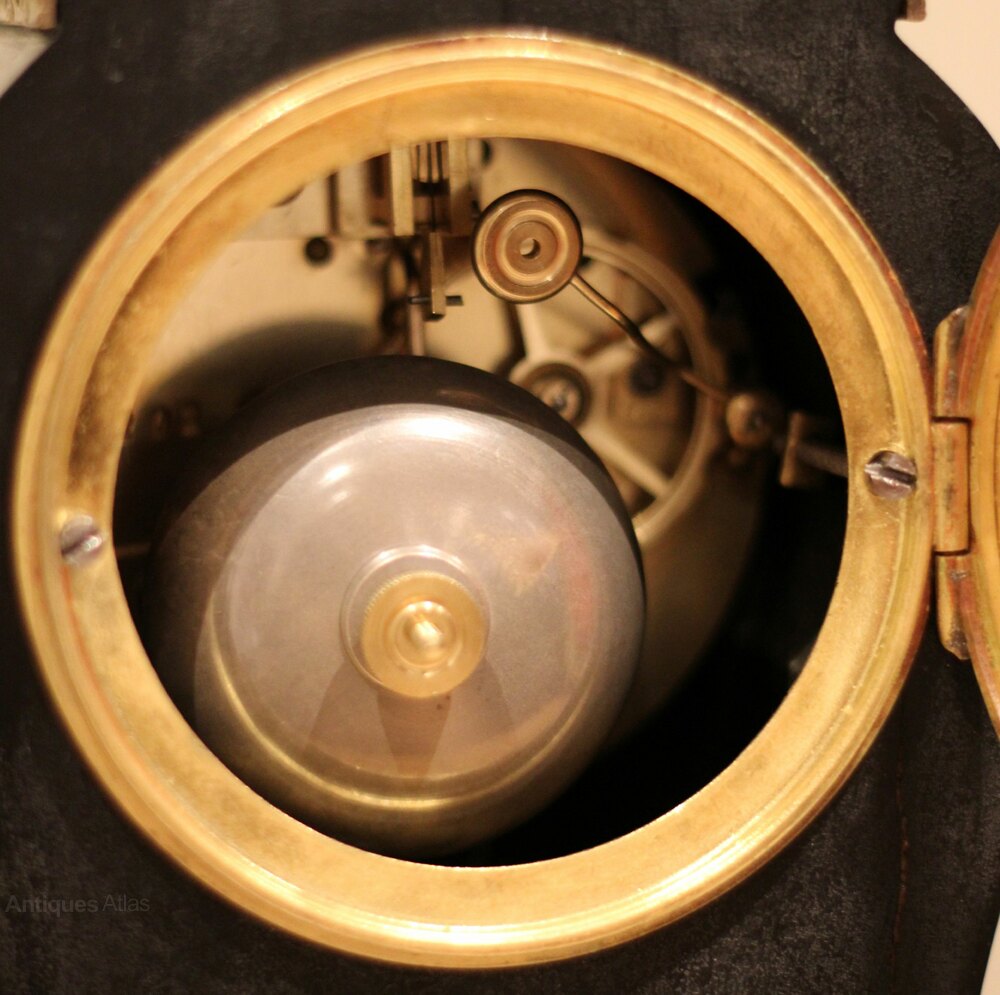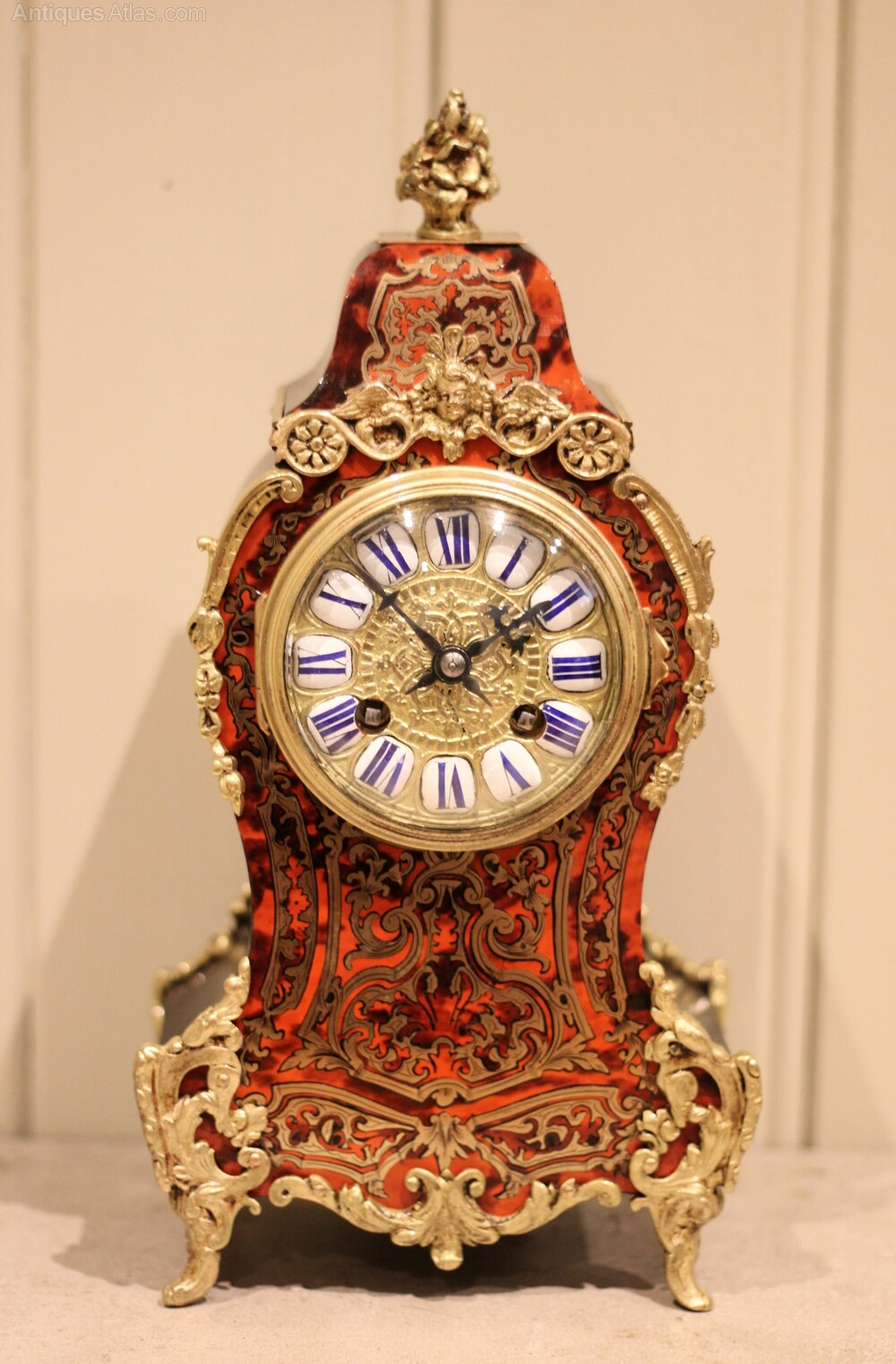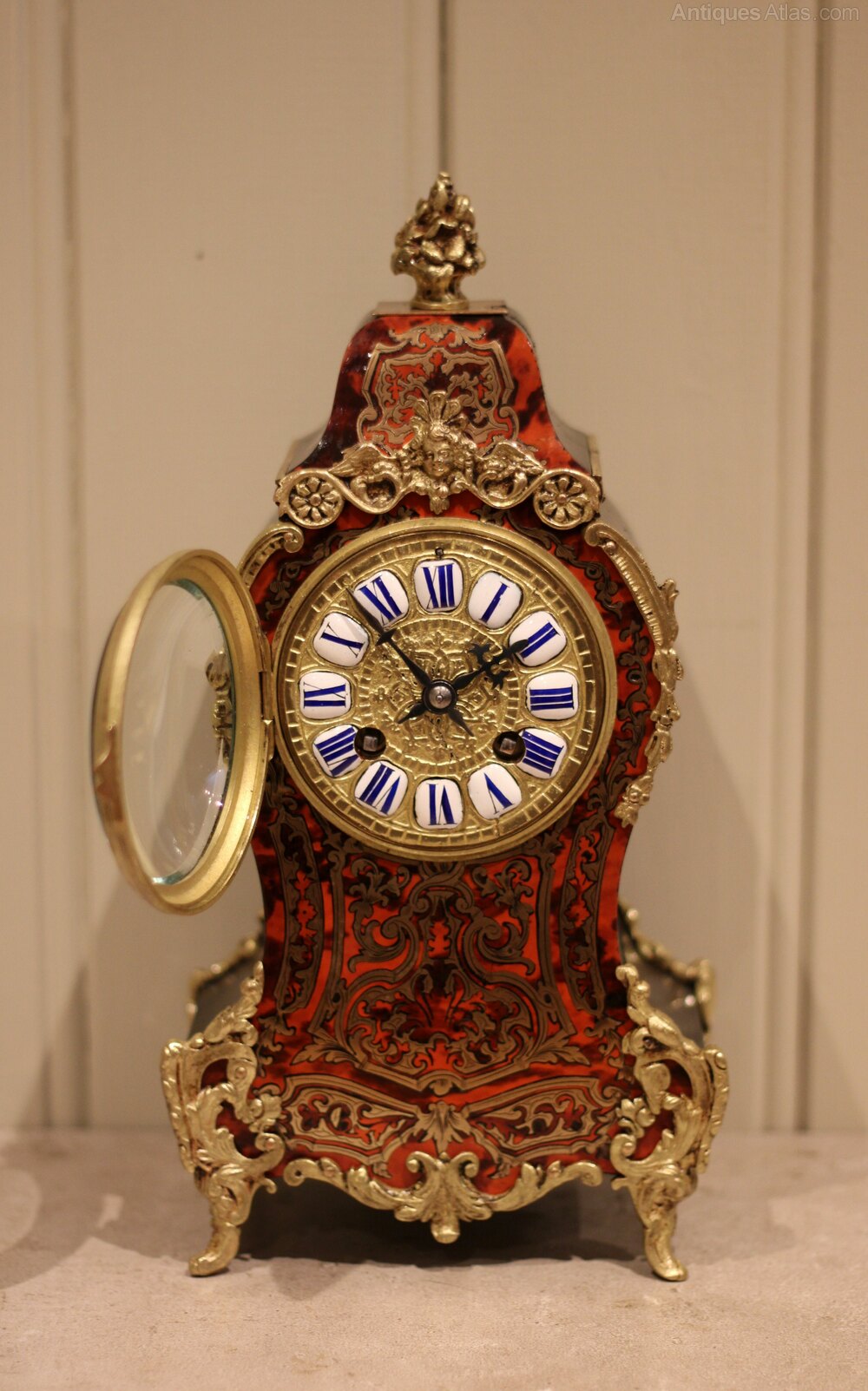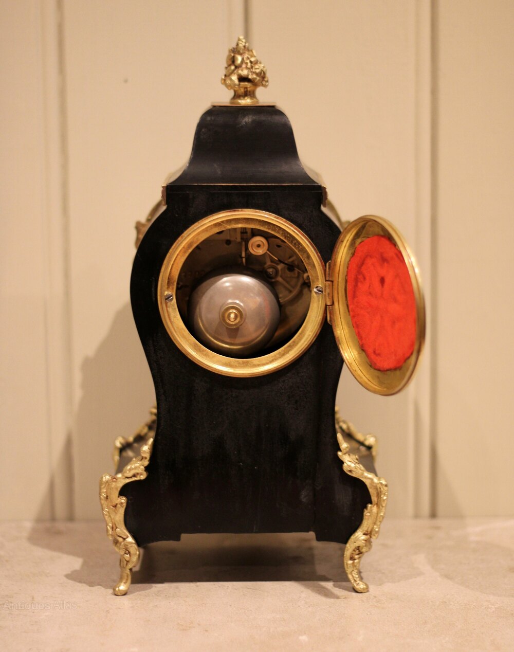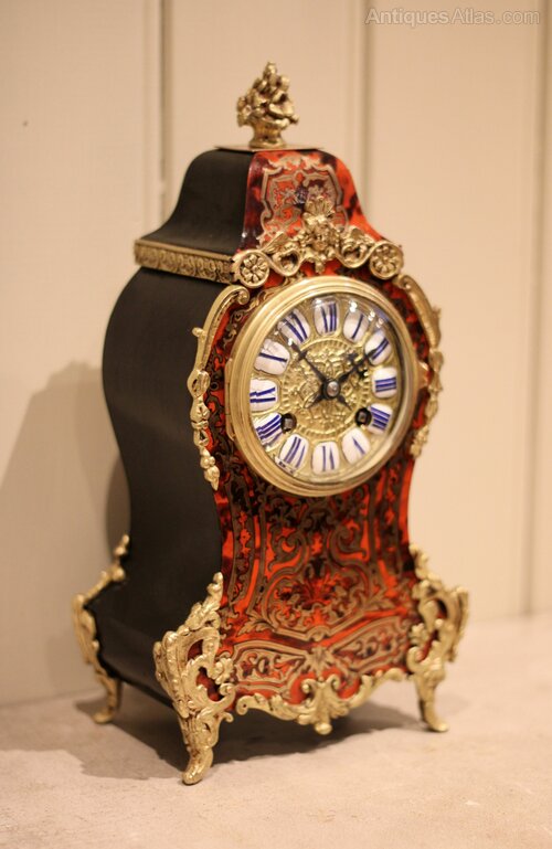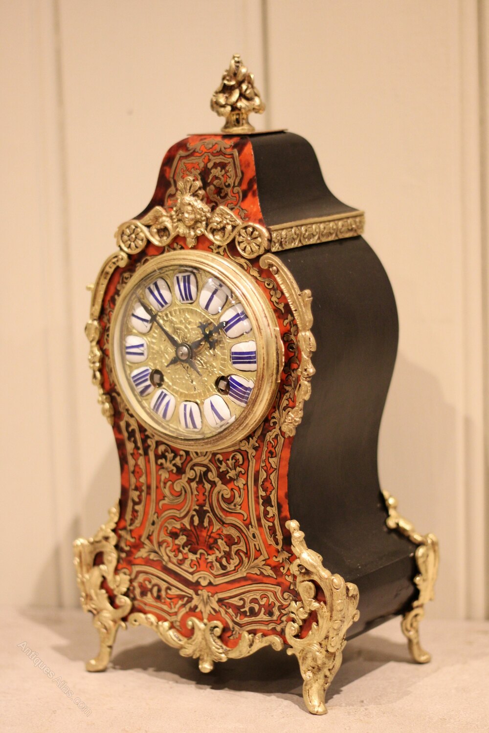 A French bell striking mantel antique clock, that was originally made for the British market. It has a waisted shape case, with tortoiseshell , inlaid with engraved brass .The embossed brass dial is behind a convex glass and has enamel numeral plaques . It has an 8 day, hour and half hour bell striking movement .