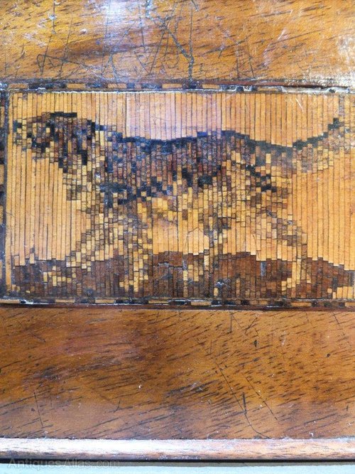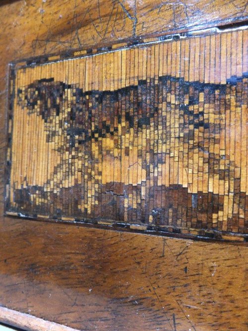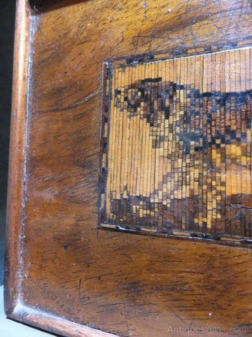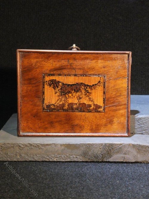 An engaging Tunbridgeware fragment depicting a gun dog set within a mahogany frame. Some minor loses to the inlaid border. English circa 1820-30. £225 12.5cm x 10cm.