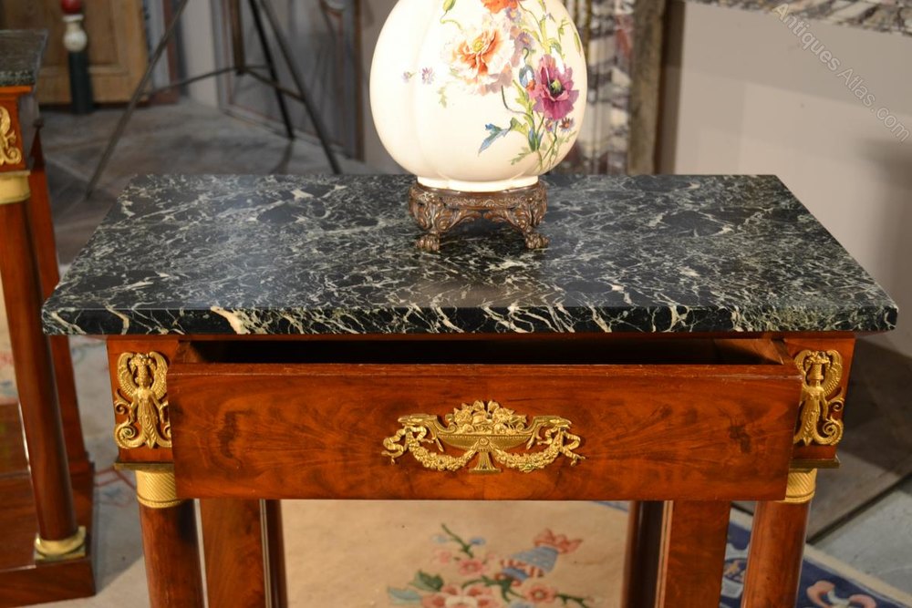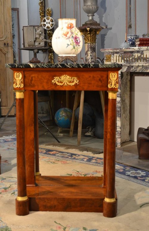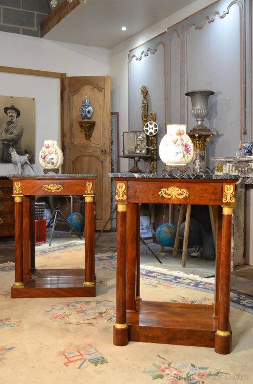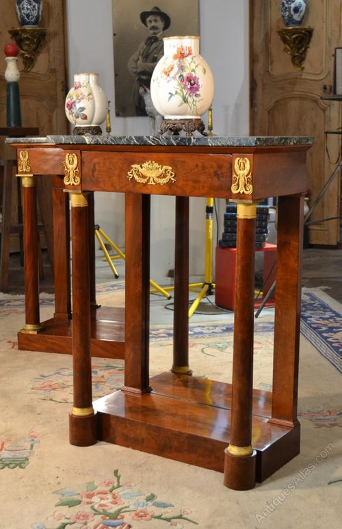 Two consoles in mahogany veneer, Empire style. The gilt bronzes are identical, the rings are slightly different, on one of the consoles the columns end on the entablature and on the other they end to the ground, the latter has a drawer belt. Top marble green sea color. These two small consoles are period antique furniture but underwent changes in the middle of the 20th century, bronzes and mirrors are later and rearrange on the consoles to give a pair effect. They are sold as style furniture and not period antique furniture.