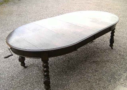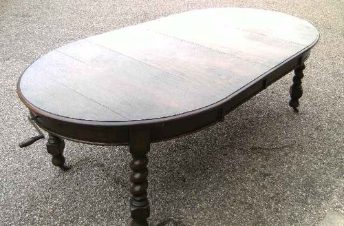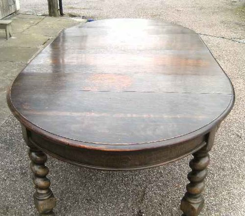 A solid oak extending table from the early 1900s. (Sorry this table is now sold but we have around 50 others in stock. Please enquire 01565 874075) This windout table dining table has two leaves which are 19ins wide and can be used with one or two in the table or indeed if preferred day to day no leaves. These two leaves are collared to give a full skirt around the table when fitted. The turned leg with the barley twist design are a little different to the normal type for this size of table and are not too chunky. This dining table will easily seat 8 people and is a 10 seater length really at 94inches with the leaves in place. Priced as an 8 seater it is good value for money at £1375 fully restored, this includes checking and ensuring all joints are sound and fully re French polishing prior to delivery. We are able to adjust the final colour at this stage so it can easily be a little lighter than it currently is when we have finished the restoration, if that is what is required of course. This is a good table with the top in quarter sawn oak, showing an excellent grain as can be seen in the photograph of the top.