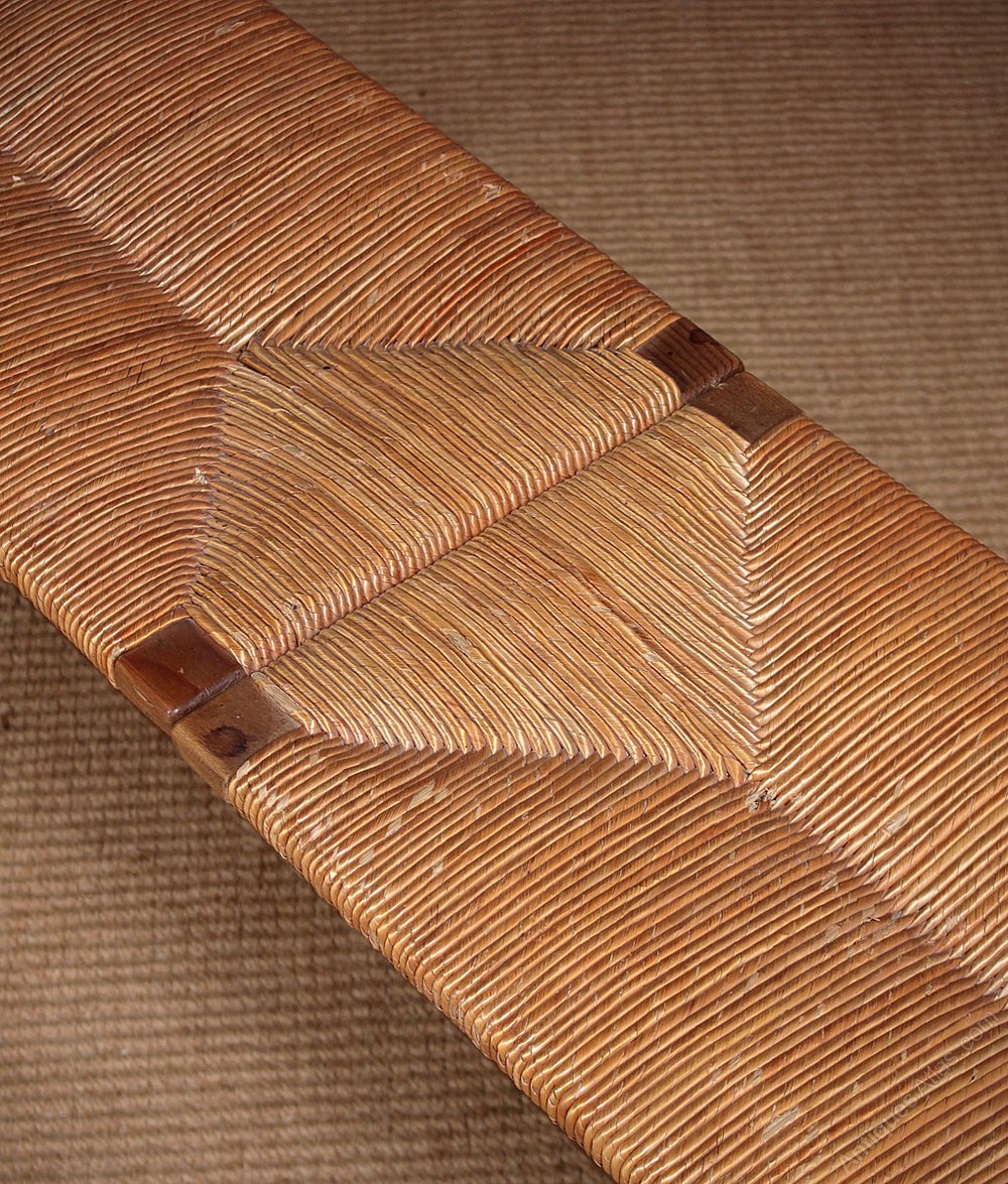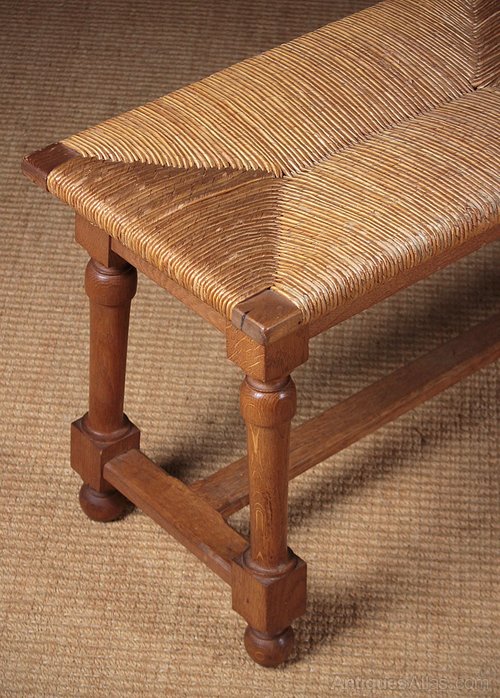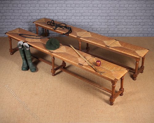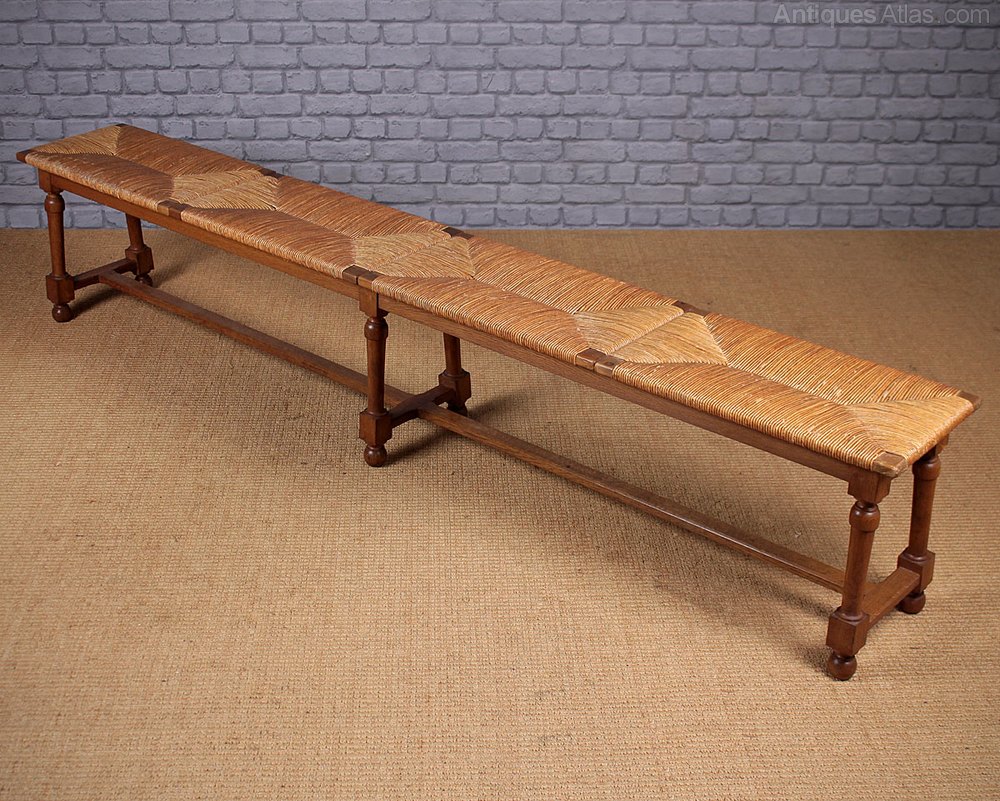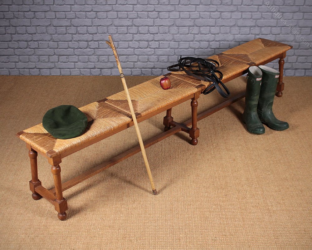 Two unusually long oak hall or tack room benches c.1950. Seven and a half feet long with woven rush seat pads on oak frames with six turned and block legs joined with full length stretchers. Excellent colour and condition, cleaned and waxed in our workshops. Priced individually.