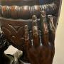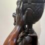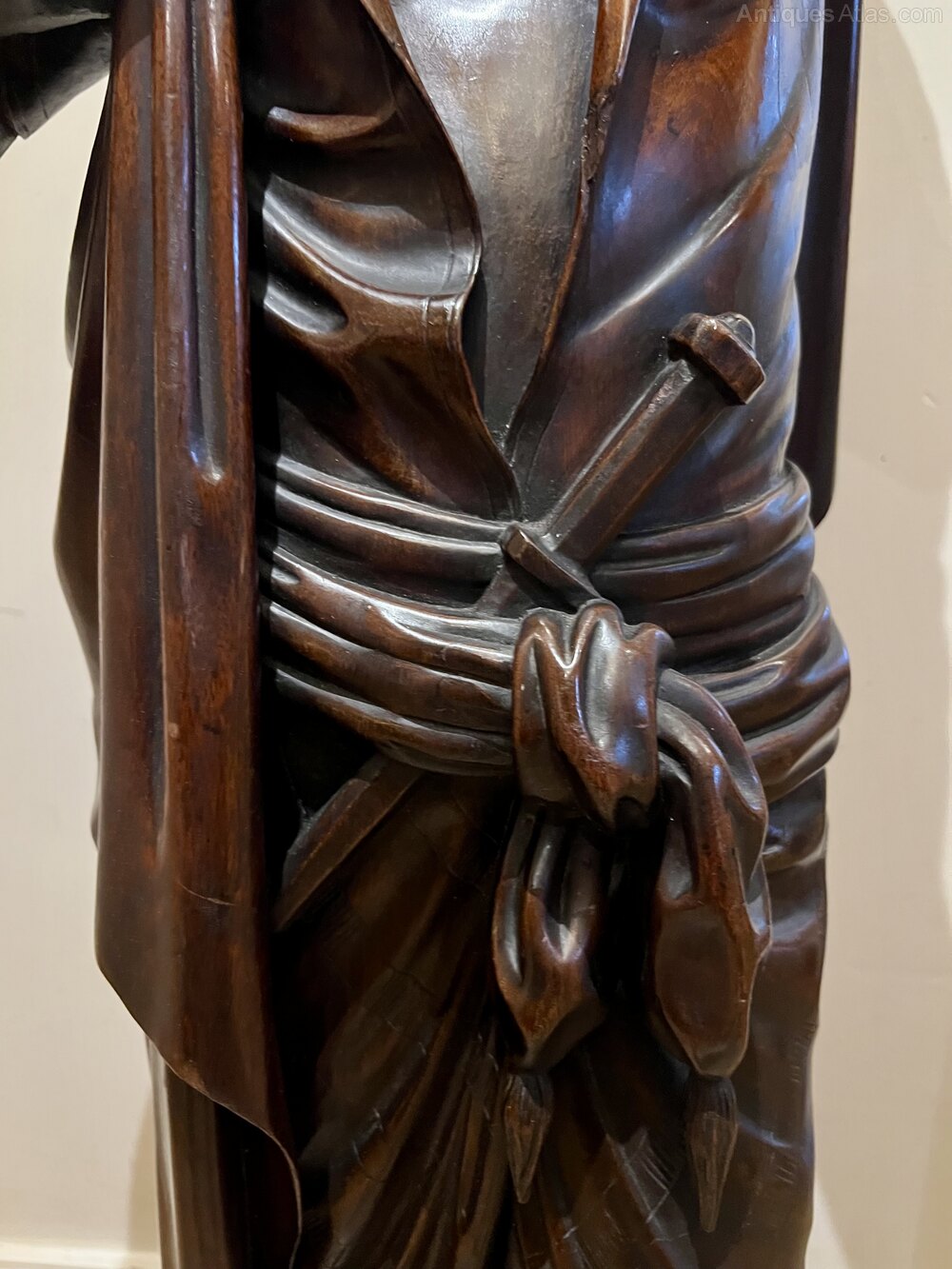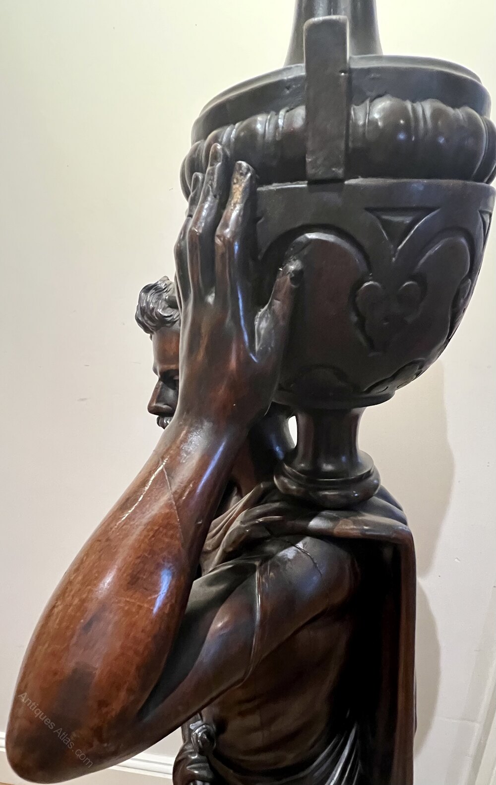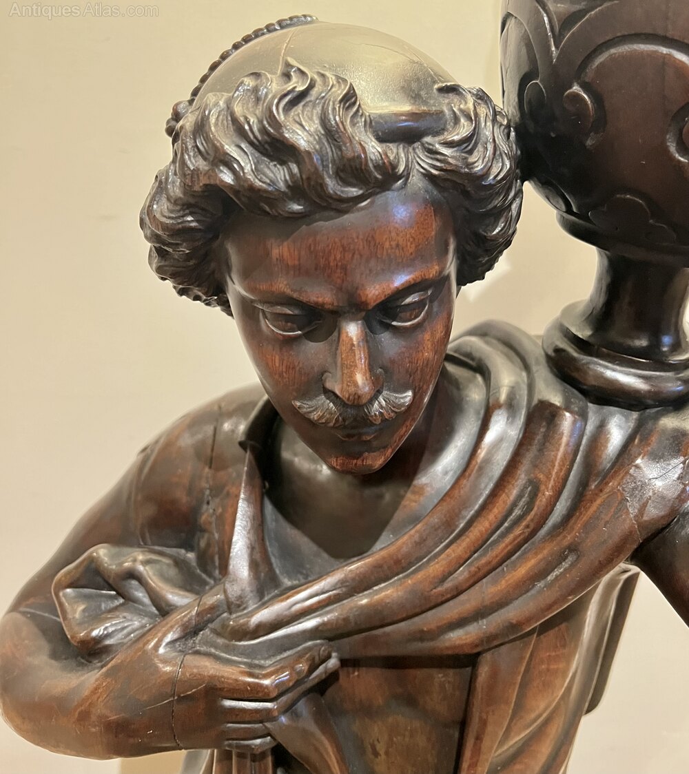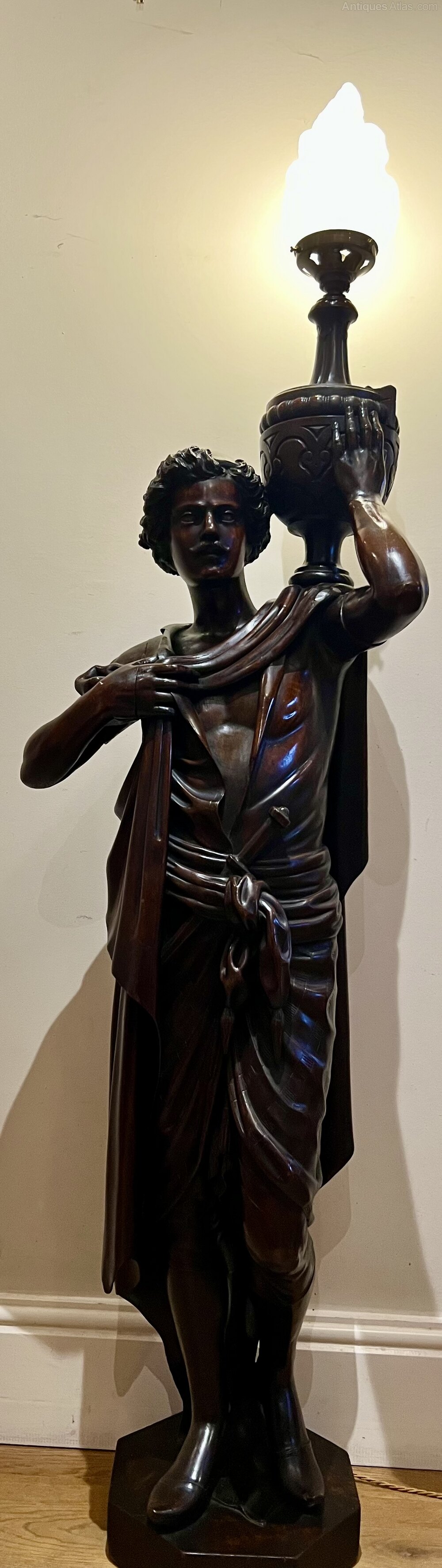 An unusual and very good quality 19th.C. three quarter life size carved walnut figure of a Grecian, Roman or Arabic gentleman as a lamp. Wearing draped robes with a dagger to his belt and shouldering an urn or wine vessel topped with a flame glass lamp shade. The lamp part has been rewired with foot on/off switch, replaced shade and fully P.A.T. tested. The carving is very crisp and the whole in very good original condition. Height…61.5’’/ 156cm. Width…17.5’’/ 43cm. Depth…15.5’’/ 39cm. Delivery to most of U.K. mainland £55.