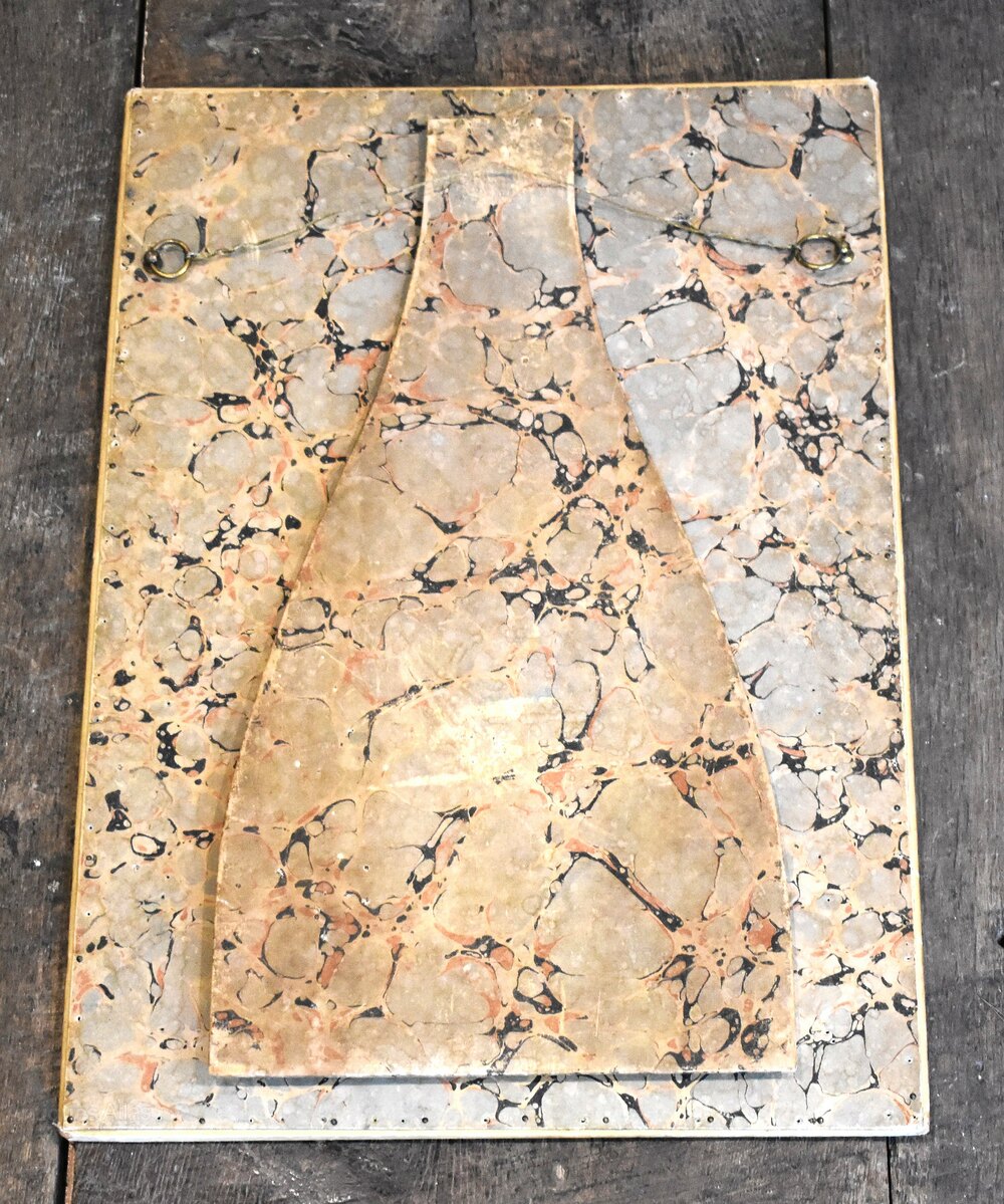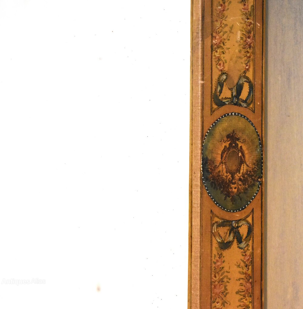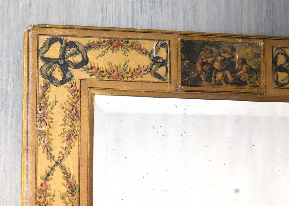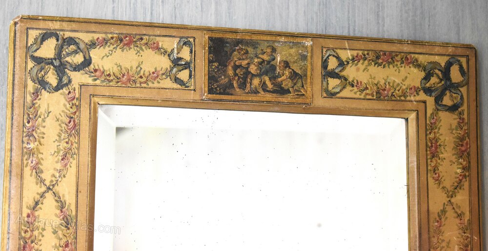 A very unusual and decorative painted silk and applique mirror. The mirror frame has a wooden base, covered with silk which has then been painted with swags and ribbons in the rococo manner. There are also printed applique panels applied to the frame. The mirror plate is the original and has a nice bevelled edge. The mirror has been made to function as a wall mirror or as a table mirror with an easel stand, in this regard the back is beautifully finished in marbleised paper. The whole is a wonderfully charming and decorative piece in excellent condition. C.1900.