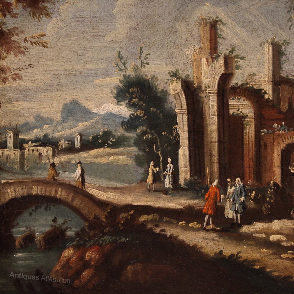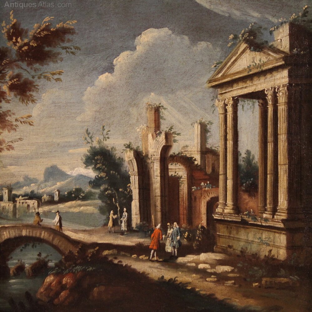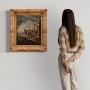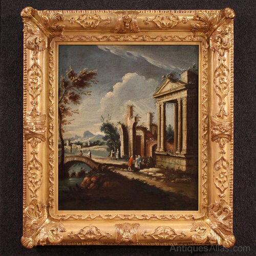 Refined Italian landscape from the second half of the 18th century. Oil painting on canvas depicting a splendid view with ancient ruins and figures in Venetian dress, of remarkable pictorial quality and rich in minute details. The artwork clearly fits into the tradition of eighteenth-century Venetian architectural capriccio and the label on the back features the name of Antonio Visentini (1688-1782), a well-known view painter and engraver (The painting is not currently accompanied by an expertise, but it is possible to request one upon payment of the relevant additional costs). Spectacular 20th-century frame in carved and gilded wood, with some signs of aging. Painting already restored with relining, replacement of the frame and recoloring in small spots. Overall in good condition. Interior size H 53 x W 44.5 cm.