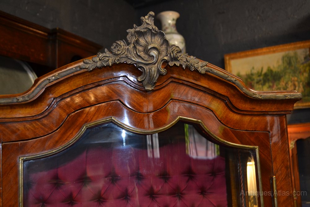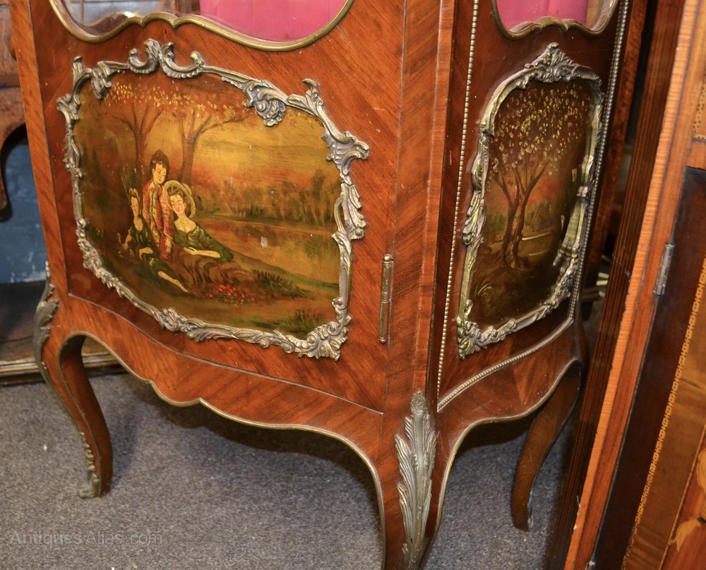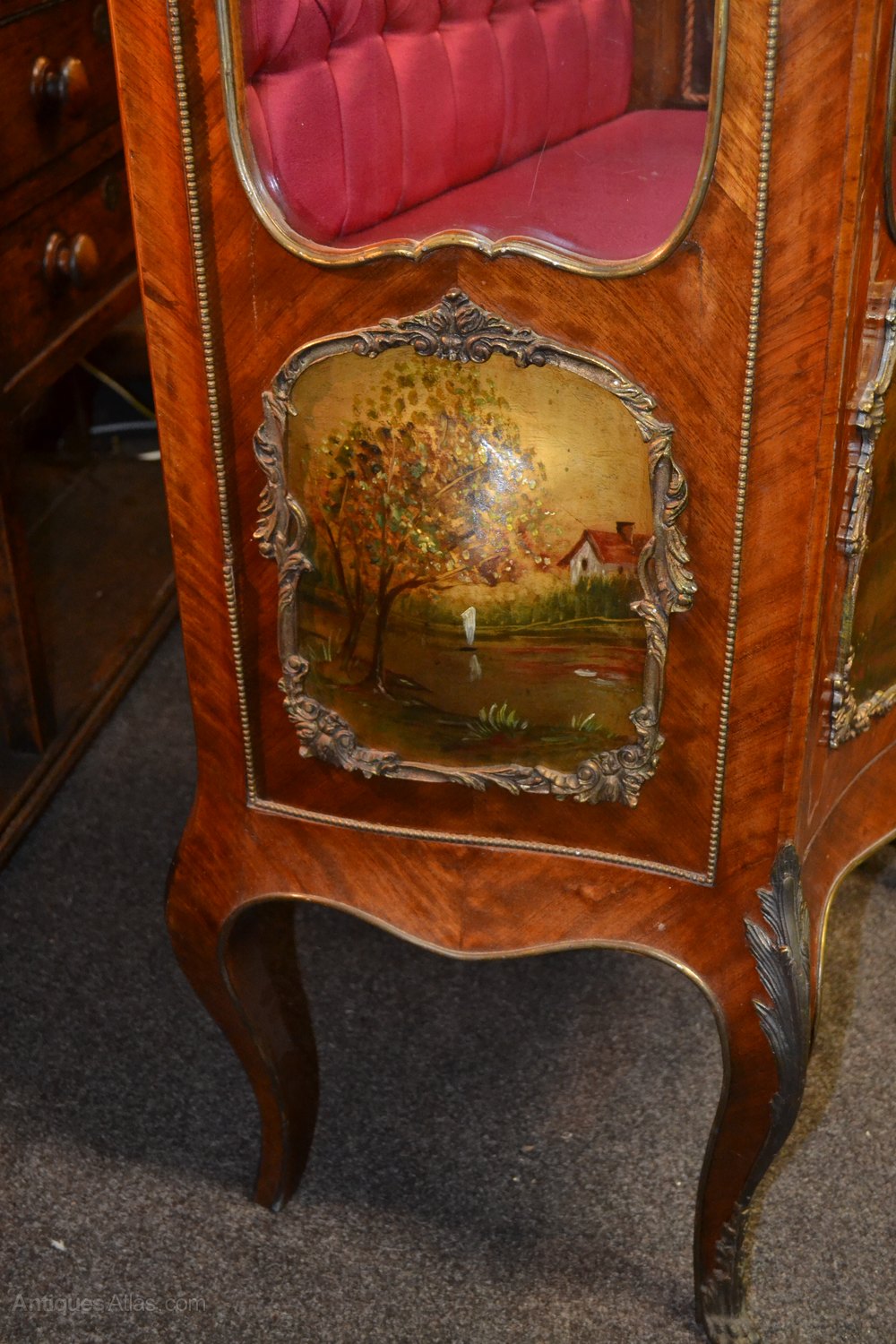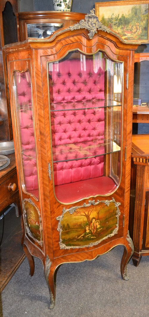 An attractive Rosewood and hand decorated Vernis-Martin Vitrine, featuring a red satin padded interior and two glass shelves. There is a hand painted scene to the front and the two sides making this item with Ormolu to the top and base, a highly decorative and impressive item.