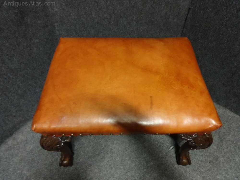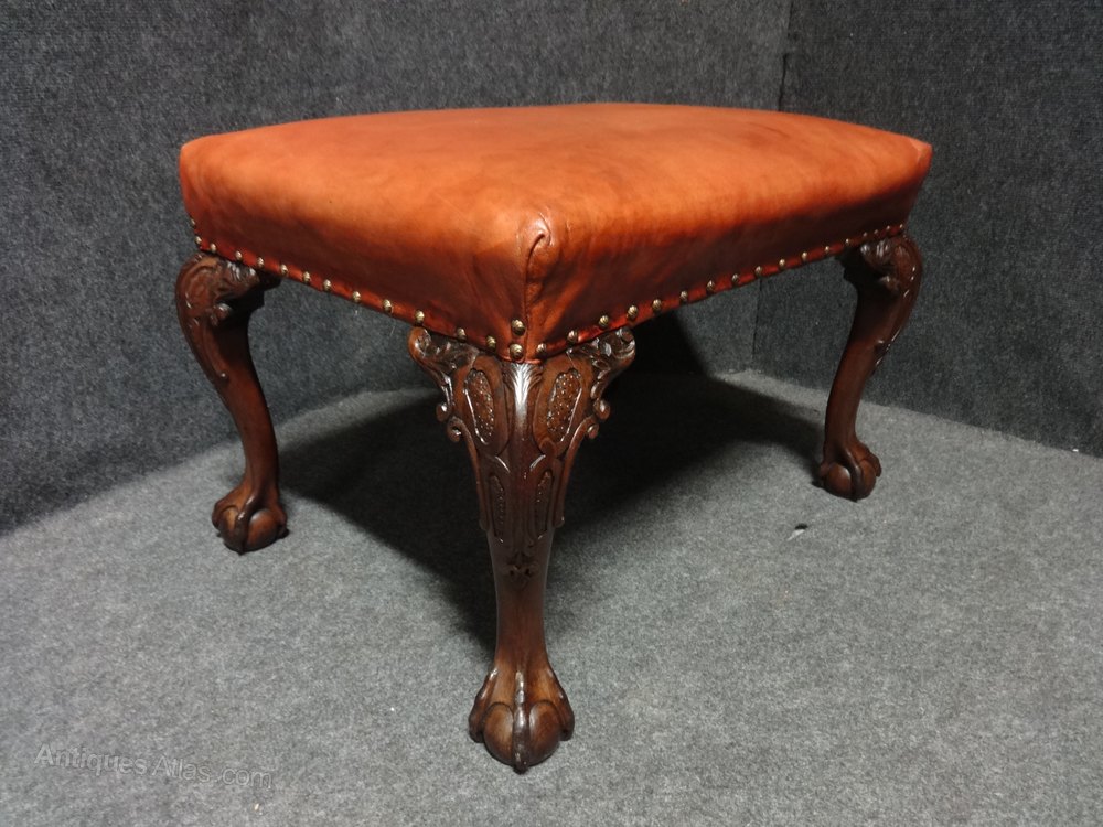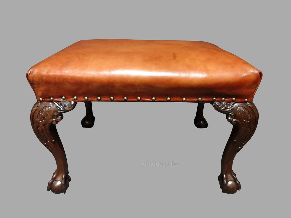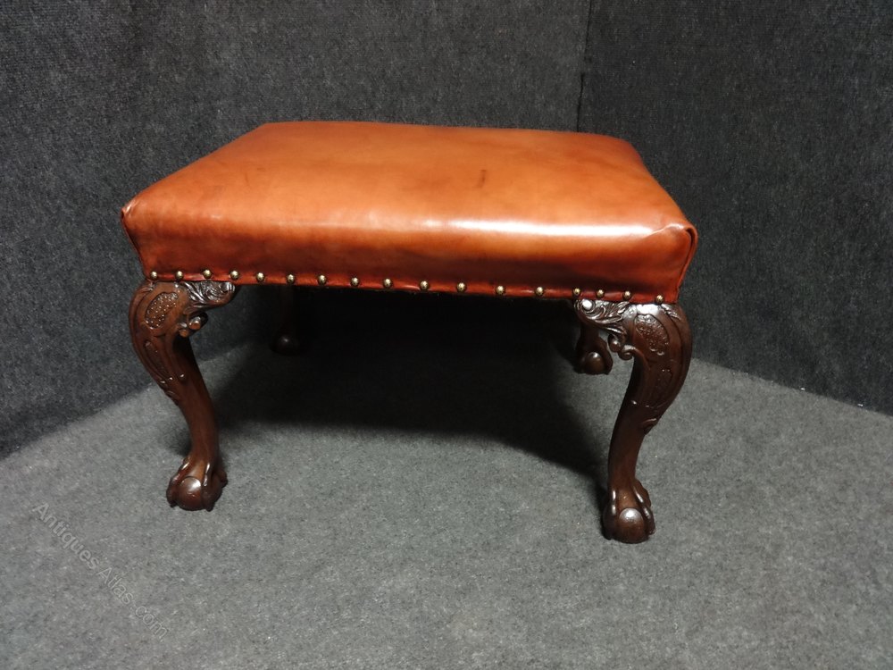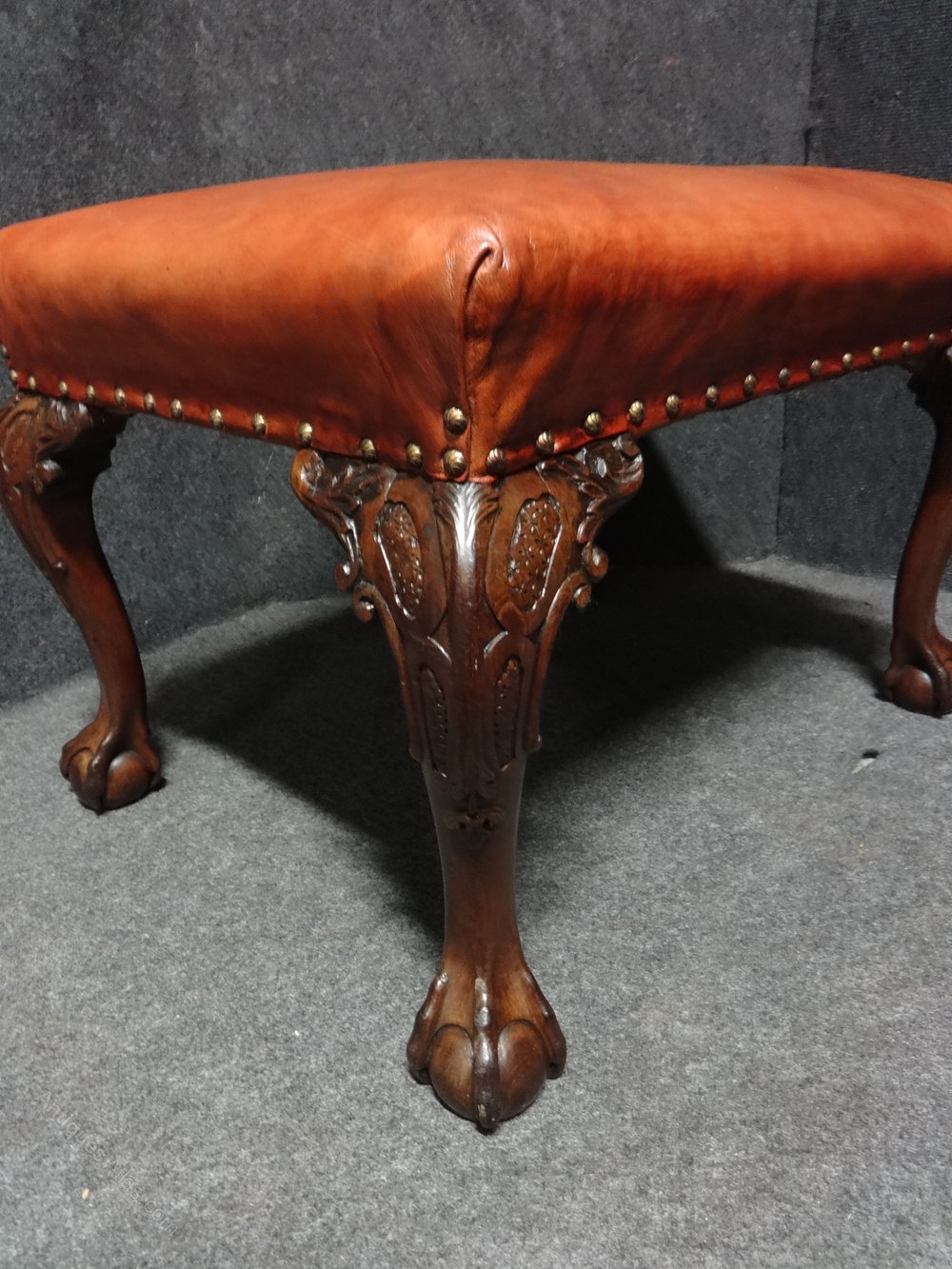 In excellent condition, mahogany ball and claw foot stool with brass studded tan leather top, in excellent condition.