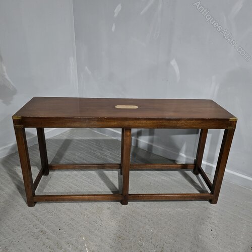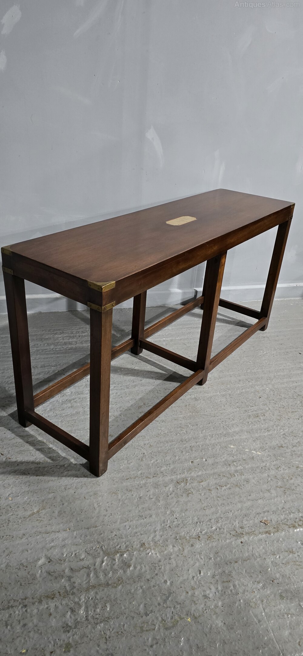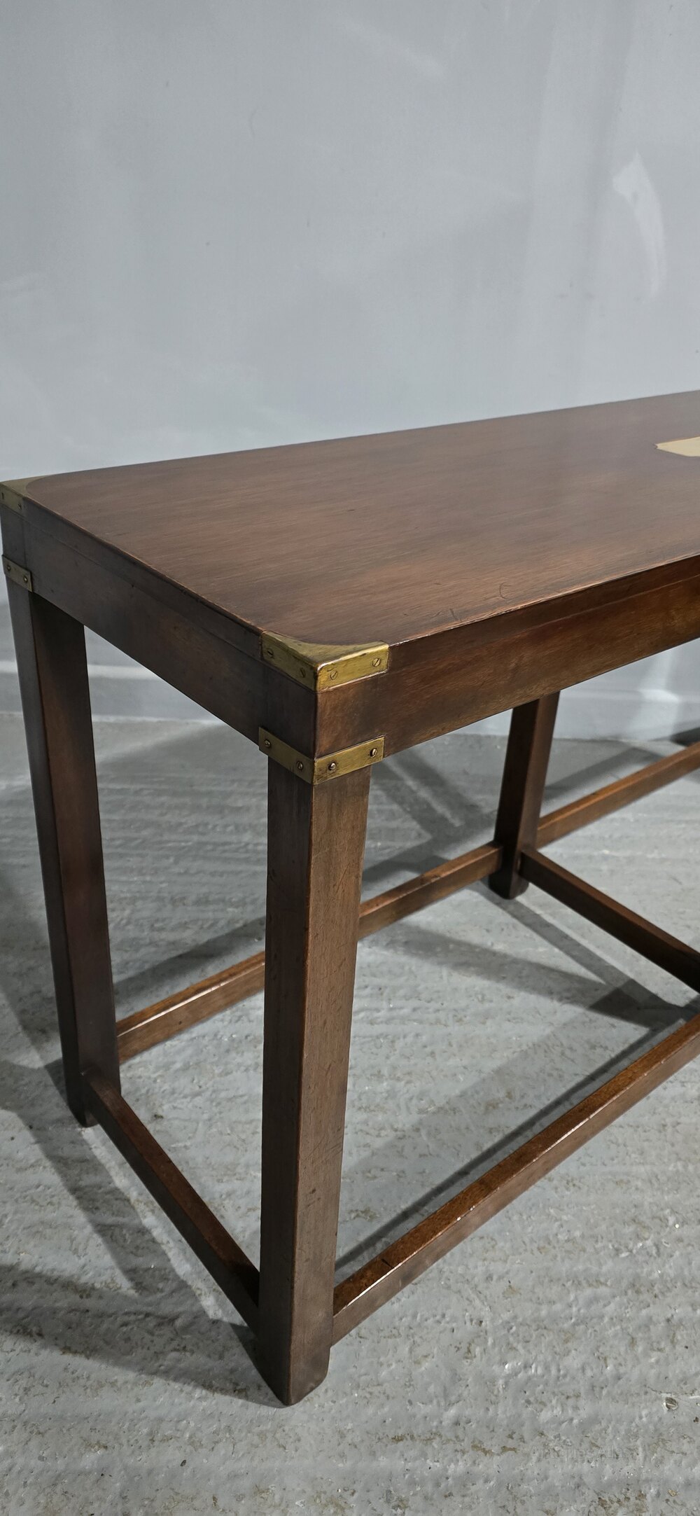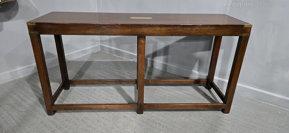 A very nice quality mahogany six leg campaign console table with central brass plaque, inset brass banding and corner insets, in overall very nice house ready condition.