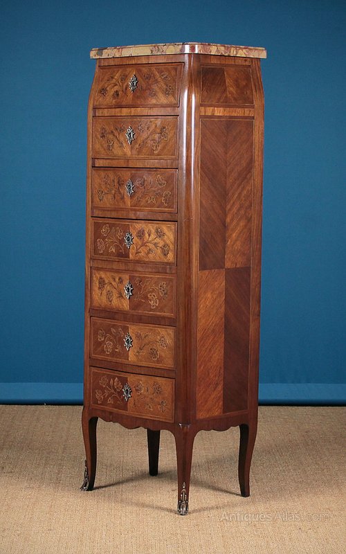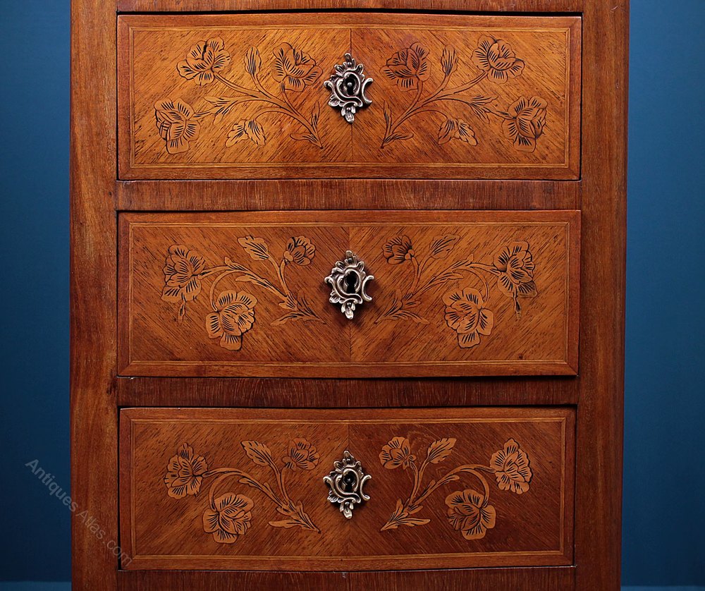 Diminutive early 20th.c. French semainier chest of drawers c.1930. So called because it has seven drawers, one for each day of the week, ideal for clothes, accessories or even filing – the drawers being big enough for sheets of A4 paper. Just 17″ wide, original marble top with shaped and moulded edge over seven serpentine fronted drawers with symmetrically arranged walnut veneers with floral pattern inlays, an inlaid and crossbanded border and ormolu escutcheons. Bombé shaped top, veneered and inlaid sides, shaped apron and feet with ormolu mounts. Excellent condition, cleaned and waxed in our workshops. Original key supplied.