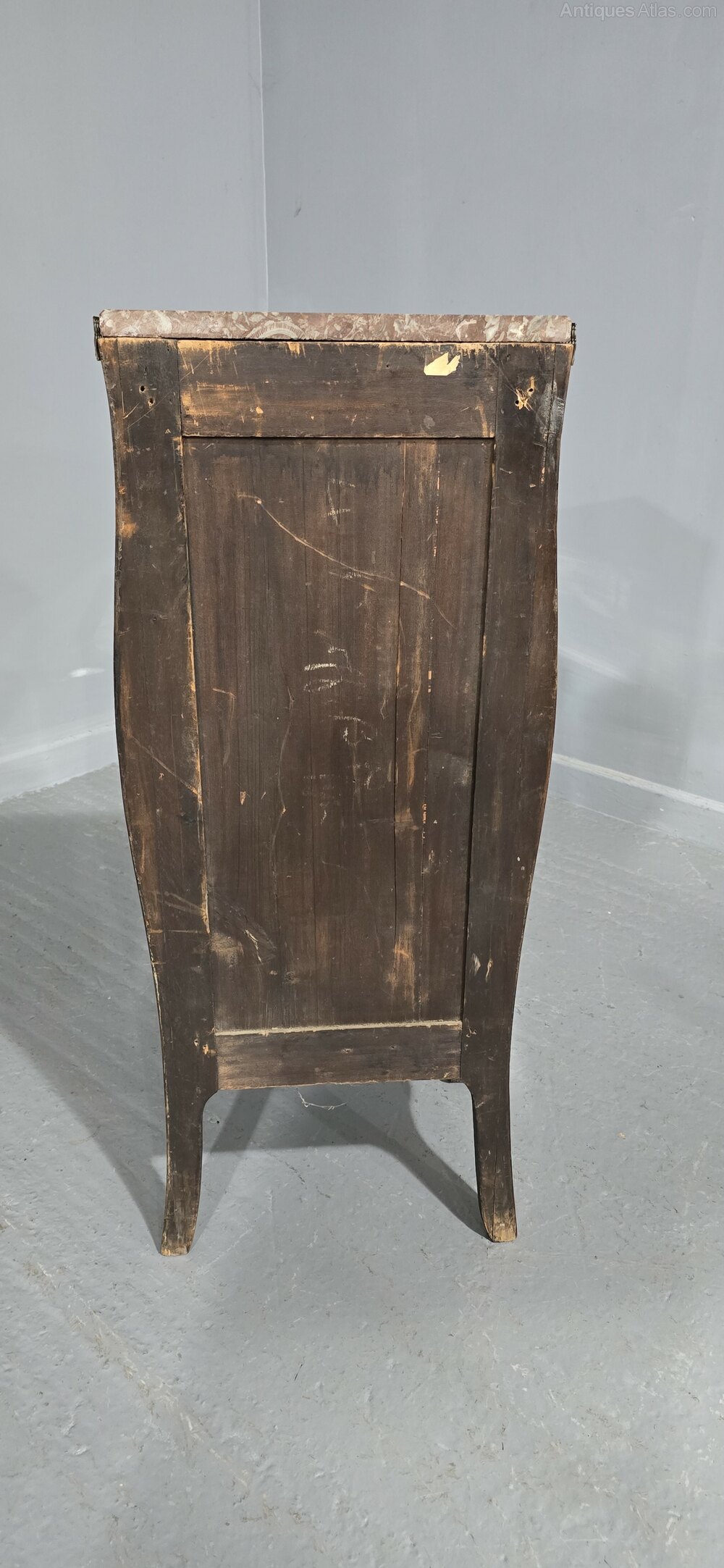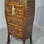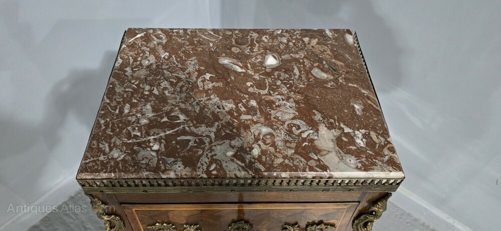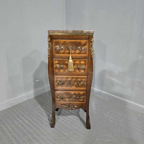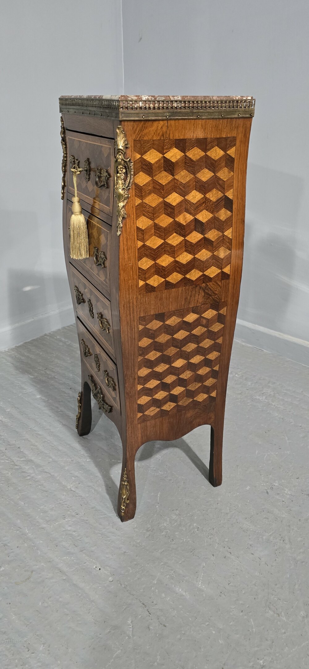 A very nice quality French parquetry four drawer chest of drawers of small proportions, with ormolu handles and mounts, brass gallery surroundng lovely marble, working key, in overall excellent condiiton.