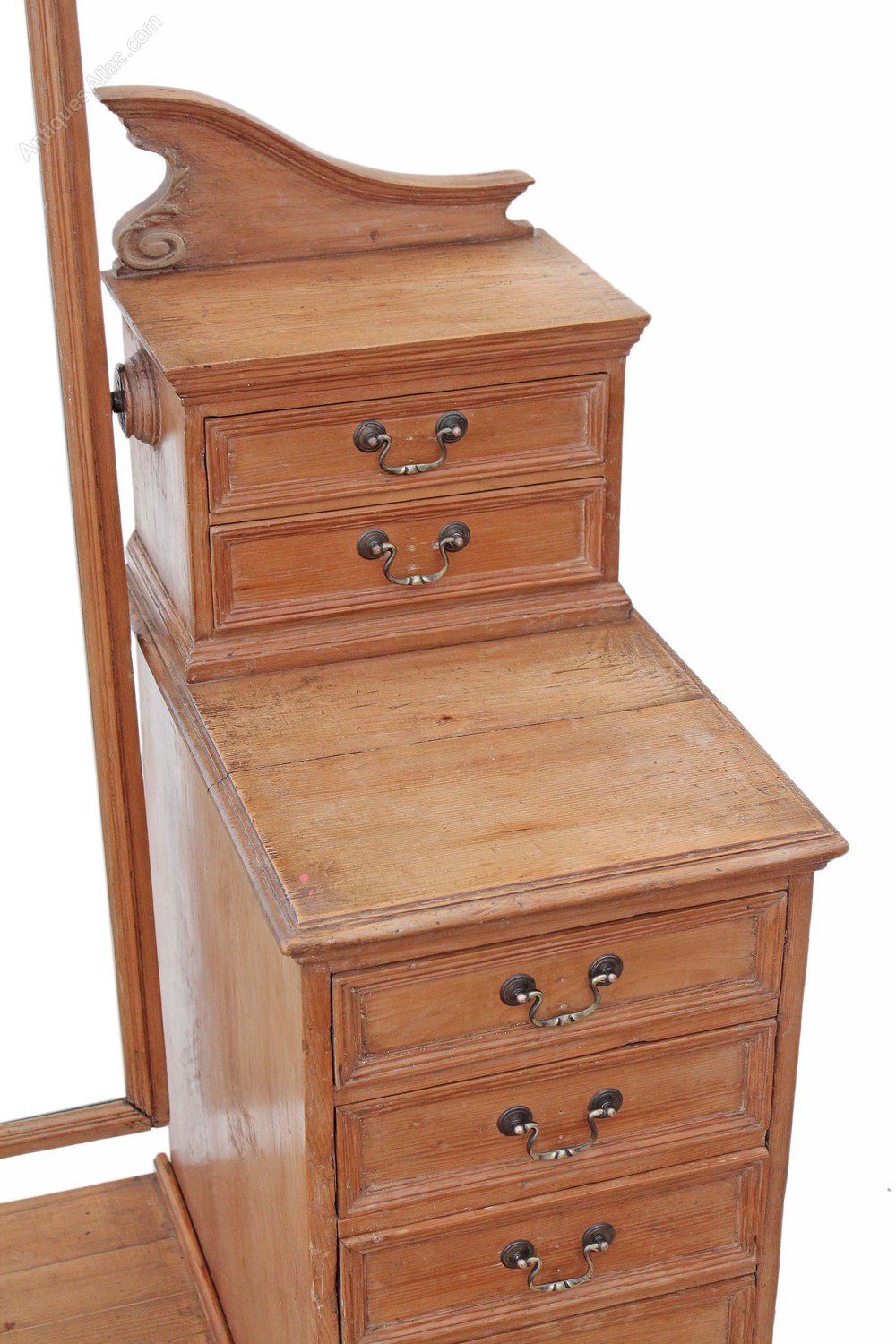 Historic knocks, marks, cracks, scratches, wear, imperfections, repairs and alterations, as is always the way and to be expected with genuine antique furniture. Later handles and mirror clamp bolts (but the mirror holds its position quite well). Mirrored glass may be later with only minor imperfections. Some historic cracking here and there, but this adds to the charm.