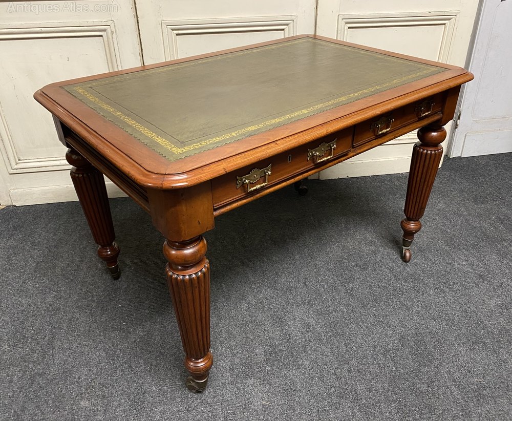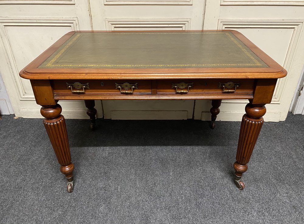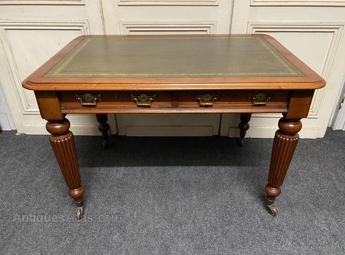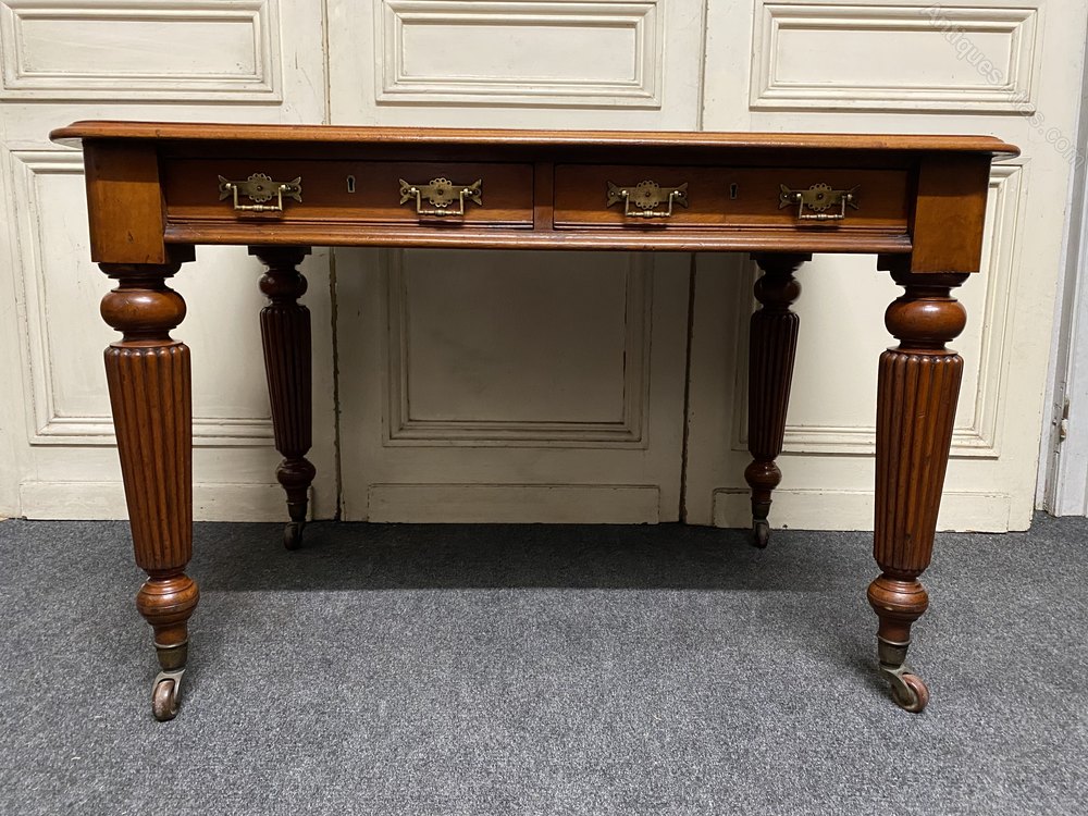 A nice quality Victorian Writing Table or Desk, having 2 drawers to the front fitted with original brass handles, lovely reeded legs ending in original castors. This table can be free standing in a room as finished right round.