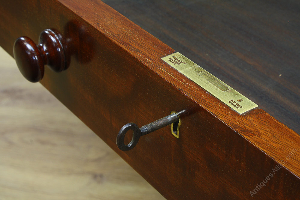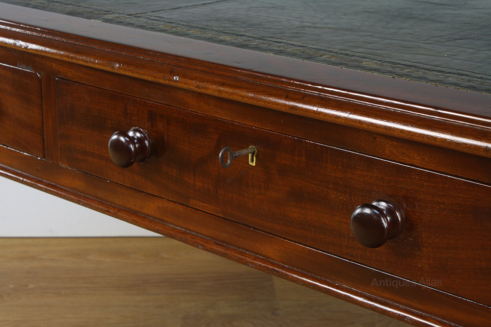 Condition This item is in excellent condition. The tabletop features a lovely mahogany thumb moulded edge, which surrounds professionally fitted new sage green and gold tool insert leather. There are no splits to the top, or marks, damage or stains to the leather. The wooden drawers, oak turned knobs, castors and brass collars are all original. The drawers are in excellent working order and close flush to the frame. Each drawer features a working lock and key. There are nominal old use marks to the leading edges of the table but nothing significant considering the age of the item. This table is solid in joint and ready to use.