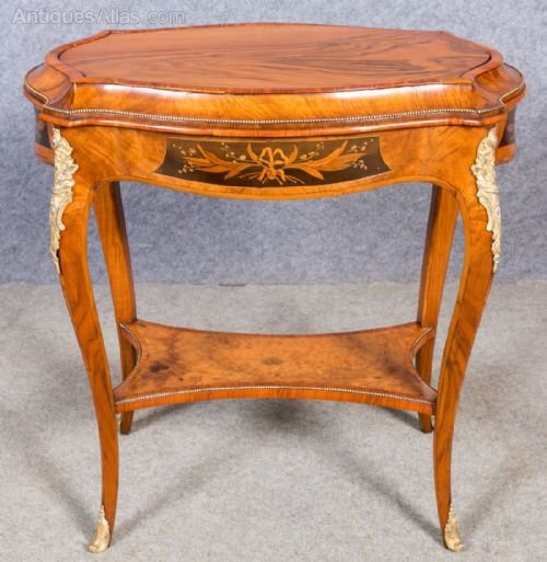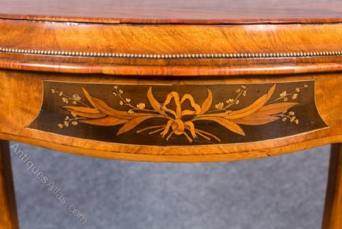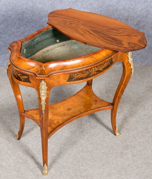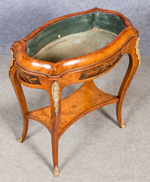 An elegant Victorian French style planter in walnut with kingwood banding. The cushion moulded top with brass beading holds the tin liner and removable lid. The serpentine shaped frieze having 4 black ground marquetry inlaid panels and the whole stands on tapering cabriole legs with ormolu mounts and sabots. The tin liner is waterproof and the lid has 2 handles on the reverse side not shown in the photos. The shaped under tier with kingwood cross banding and further brass beading. Sizes:- Height…29.75’’/ 75.5cm. Width…28.5’’/ 72cm. Depth…17’’/ 43cm. Delivery to most of UK £42.