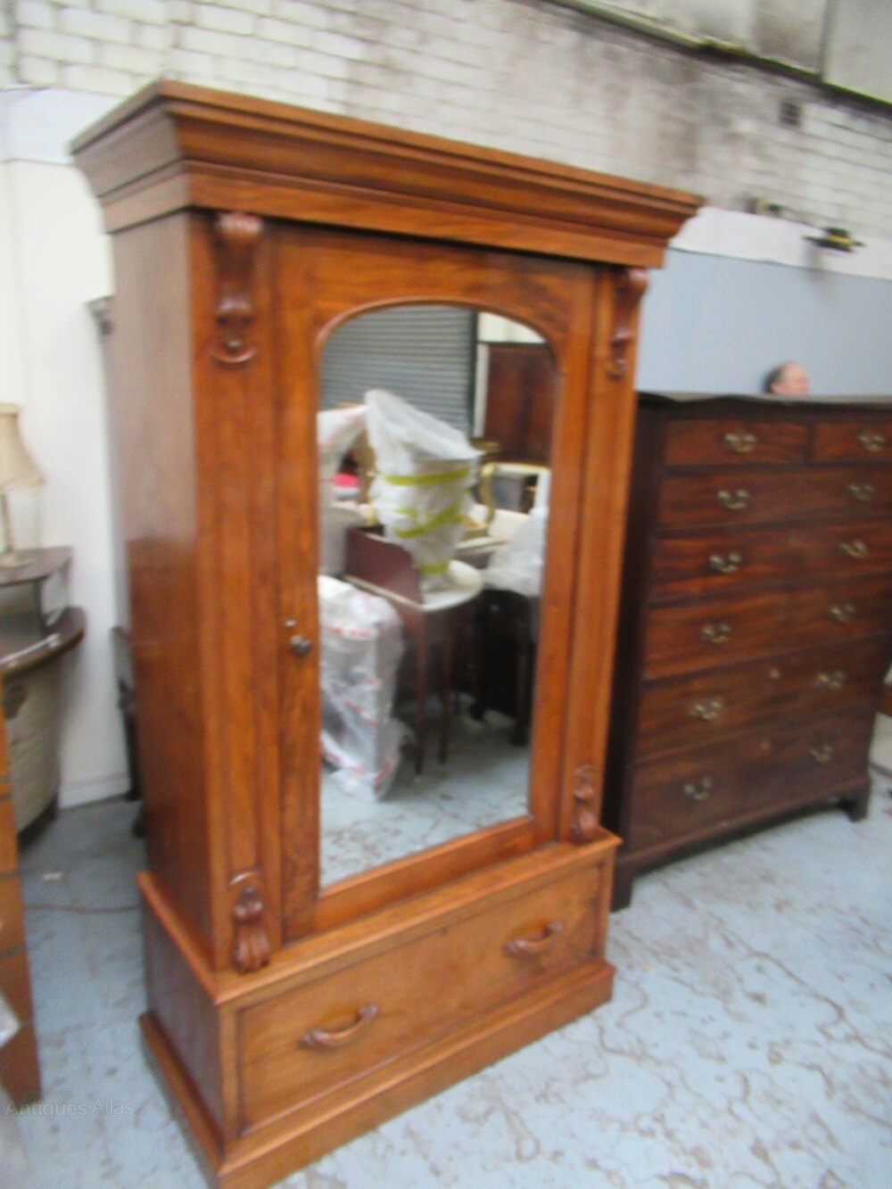 Victorian walnut wardrobe , dating from the 1870s . The wardrobe will split into three sections. With a flared top cornice , a single mirror pin type door . The interior has black and white stripe material lining , with a brass hanging rail. The base has a deep drawer with shaped wood handles.